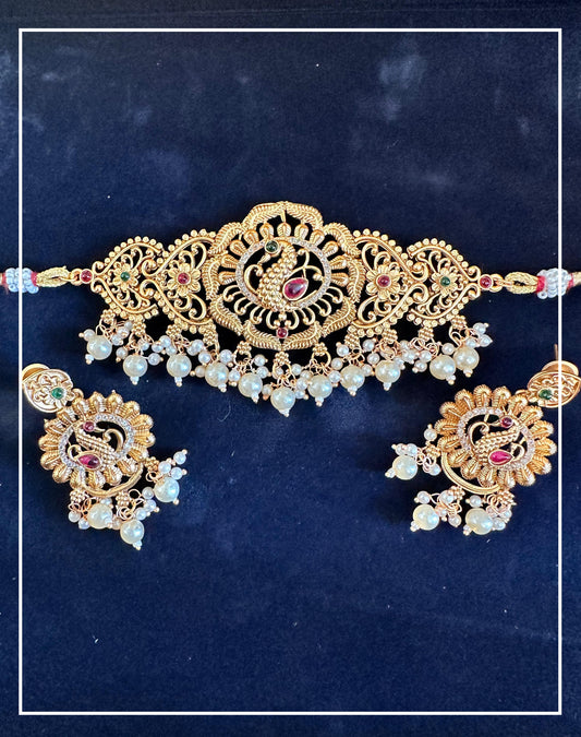 Peacock Alloy Gold and Green and Pink stone with Pearl Choker set with EarringsRegular price £40.99 GBPRegular priceUnit price / per£64.50 GBPSale price £40.99 GBPSale