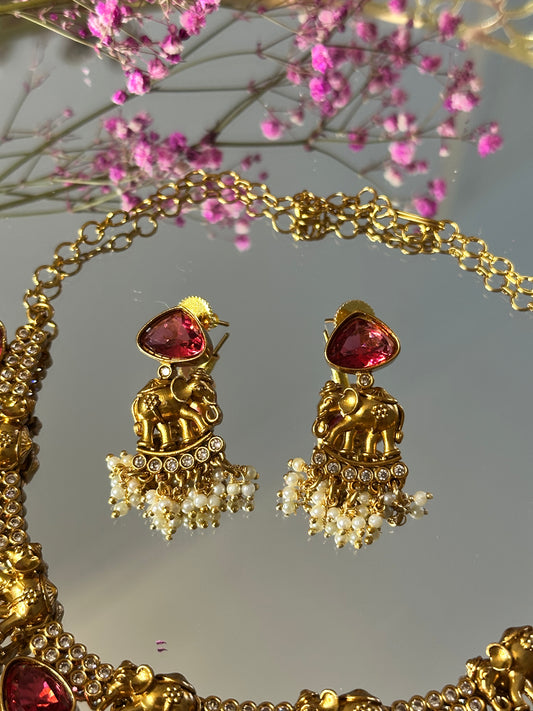 Goddess Lakshmi Pink stone Kerala Style Kodi Necklace with Golden JhumkasRegular price £40.99 GBPRegular priceUnit price / per£64.50 GBPSale price £40.99 GBPSale