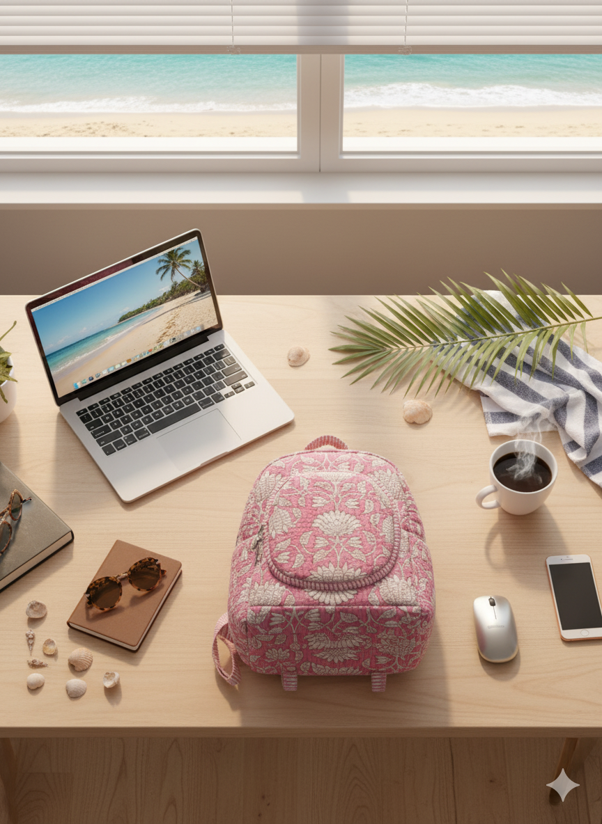 Sweet, subtle, and effortlessly chic, the Baby Blush Mini Quilted Backpack captures the essence of delicate charm. With its baby pink base adorned in a white floral pattern, this design radiates a soft, feminine grace that’s perfect for any season. Compact yet spacious, it’s perfect for your on-the-go essentials, combining style, comfort, and heritage charm in one beautiful piece. A perfect blend of functionality, artistry, and sustainable craftsmanship. Thoughtfully designed for your daily adventures, this backpack features a unique round-shaped front pocket for easy access to essentials, complemented by a spacious main compartment lined with a beautiful block-printed interior.