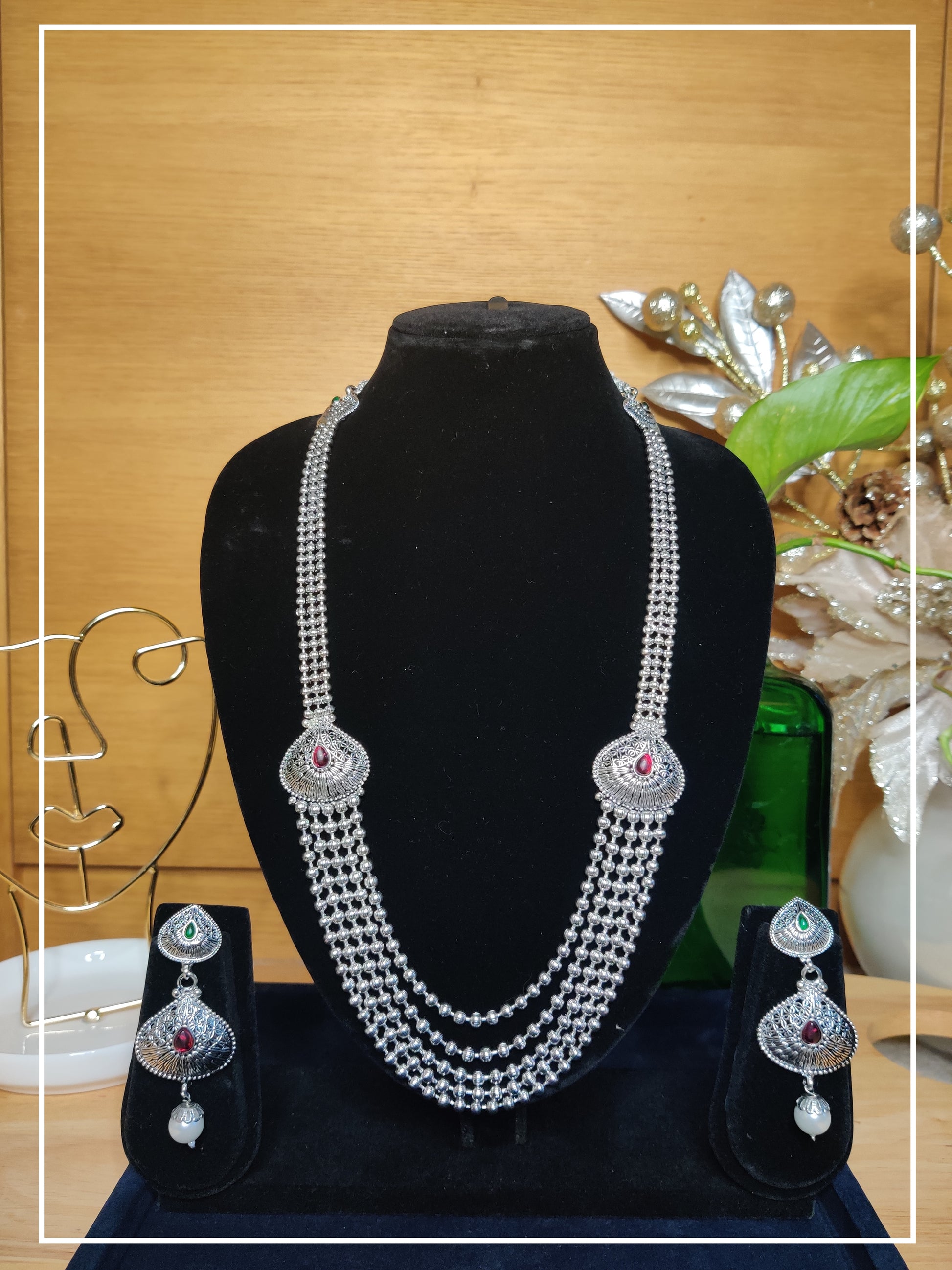Elevate your fashion with our Boho Tribal Oxidised Silver Long Layered Necklace with Earrings, a captivating ensemble that echoes the spirit of bohemian chic. Embrace a carefree and stylish look that effortlessly captures attention. Crafted with meticulous detail, the oxidised silver finish infuses a rustic charm into each element of the necklace. This distinctive treatment adds depth and character, creating a piece that speaks of cultural richness and individuality. Crafted with meticulous detail, the oxidised silver finish infuses a rustic charm into each element of the necklace. This distinctive treatment adds depth and character, creating a piece that speaks of cultural richness and individuality.