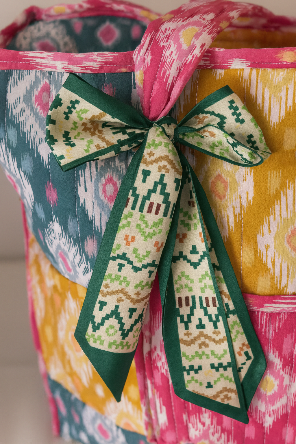 Bursting with bright, cheerful hues of yellow, pink, and greyish green, this patchwork ikat print bag is a vibrant celebration of traditional craftsmanship and modern style. Each patch showcases intricate ikat patterns, a traditional textile dyeing technique used to create intricate patterns on fabric. The word "ikat" comes from the Indonesian word meaning “to tie” or “to bind.” Each patch is woven into breathable premium cotton fabric and hand-embroidered for a tactile, heirloom feel. The combination of bold colours and timeless textile art makes this bag a statement piece for every occasion.