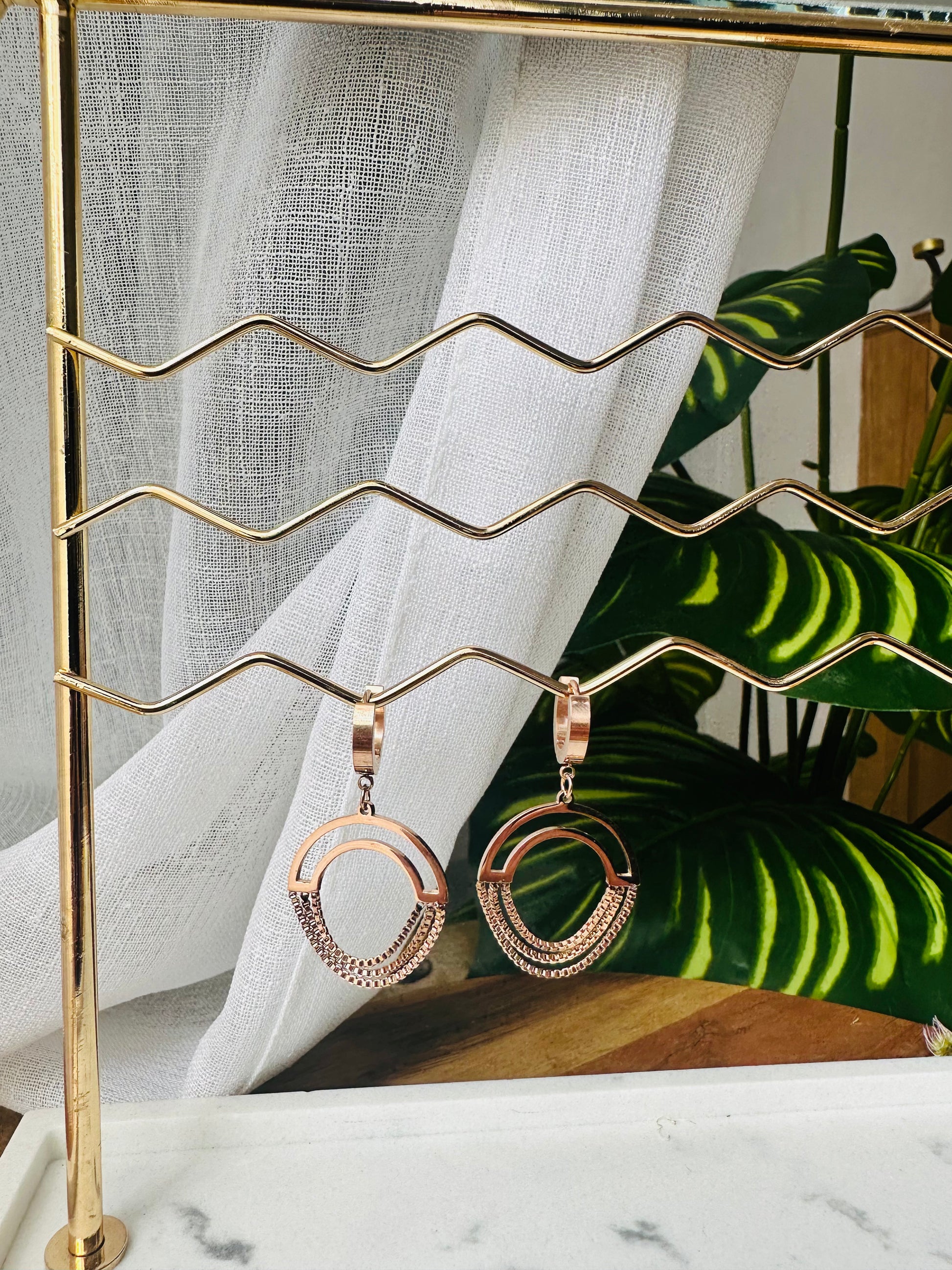 These earrings feature a unique circular shape where the top half semi circle is 2 layered solid and sleek, while the bottom semi circle showcases 3 layered chains that cascade elegantly.