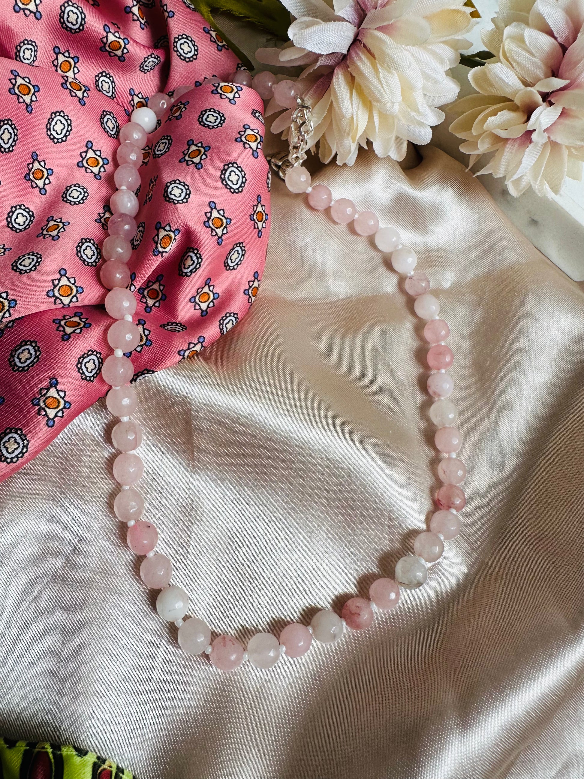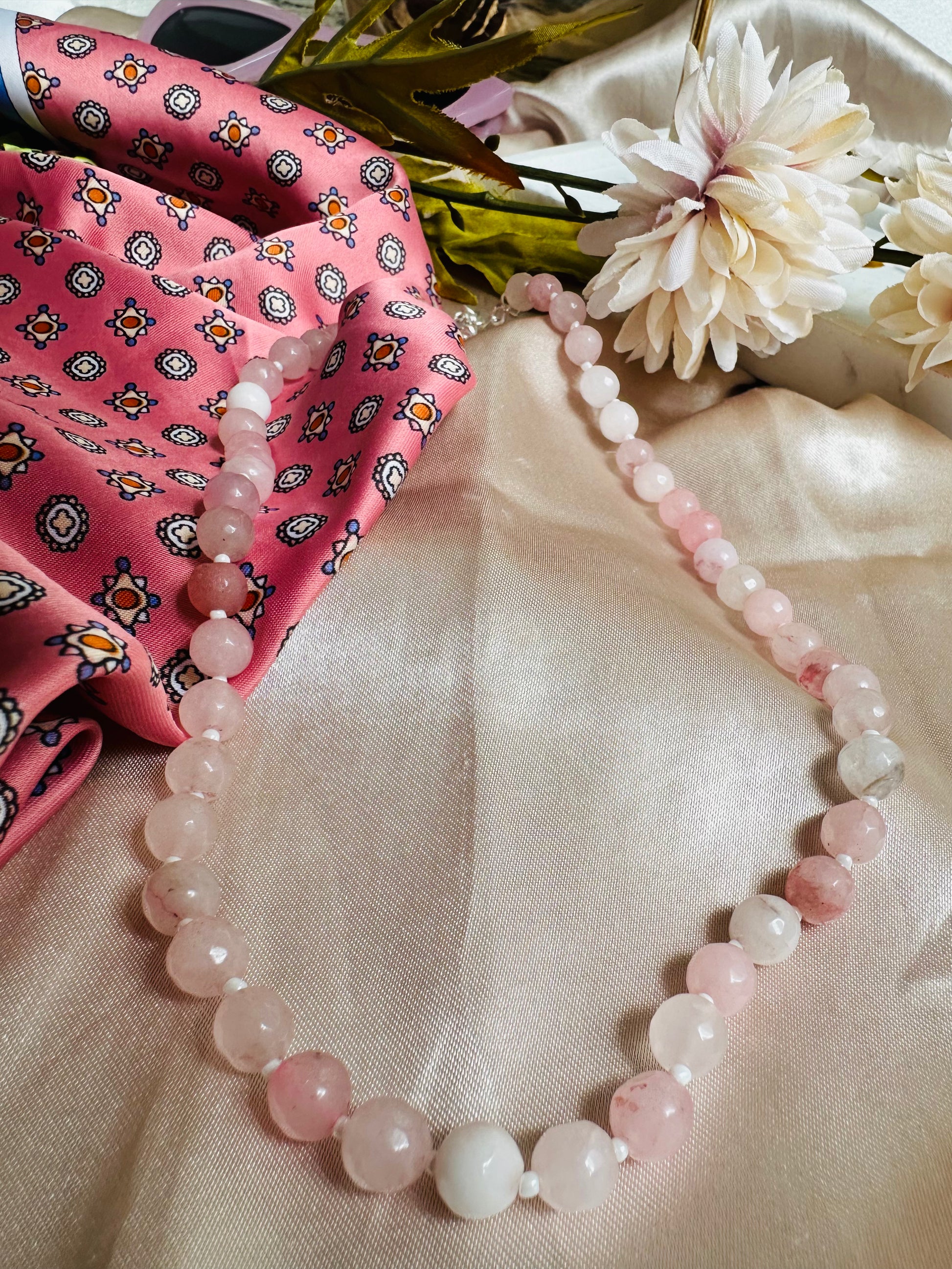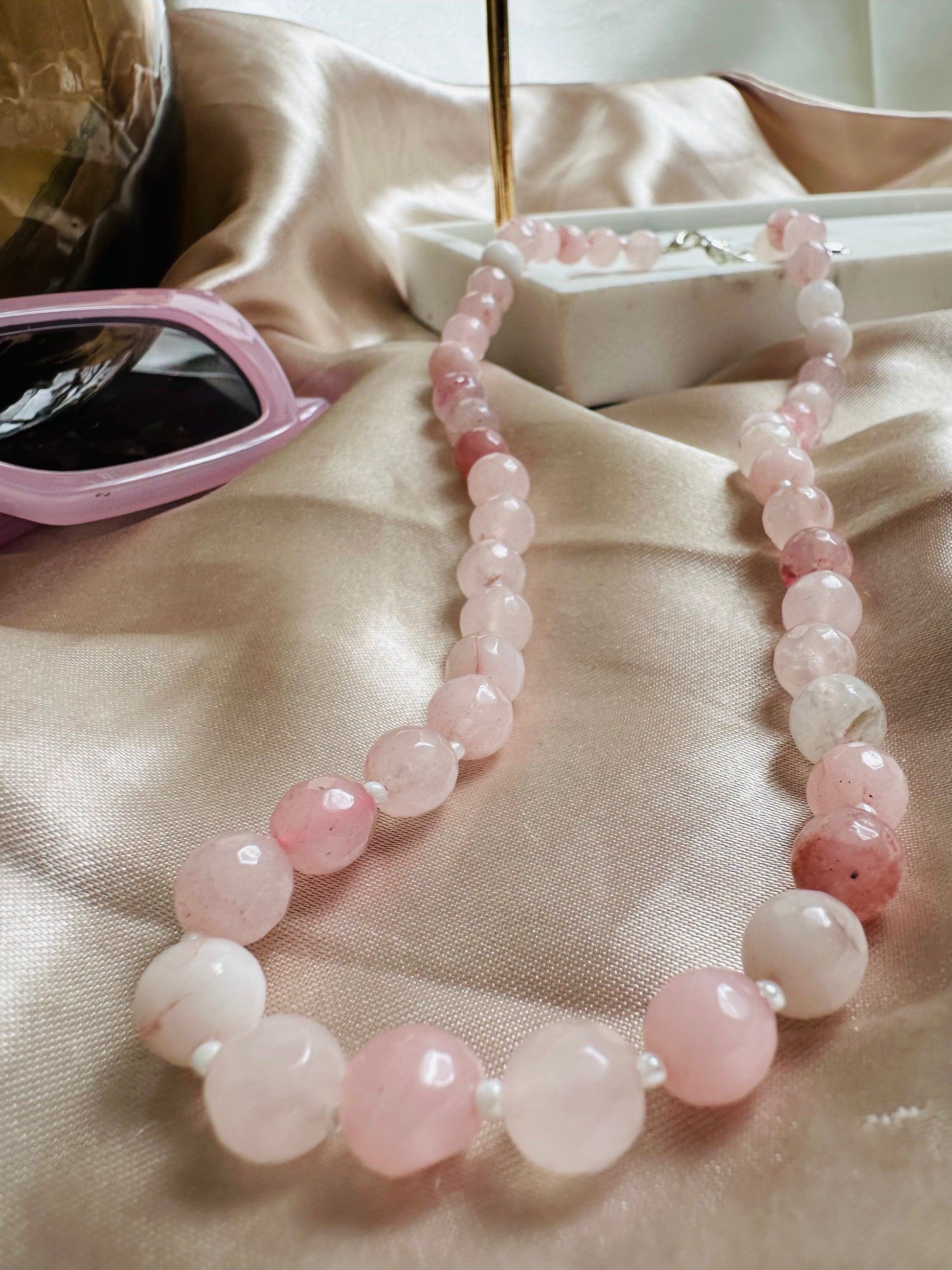 Embrace the delicate beauty of spring with the Cherry Blossom Stone Necklace. This stunning piece features a harmonious array of round stones in soft, baby pink hues, ranging from pale blush to deeper shades of rose. Each stone is carefully textured to create a natural, organic look, reminiscent of cherry blossom petals in full bloom.