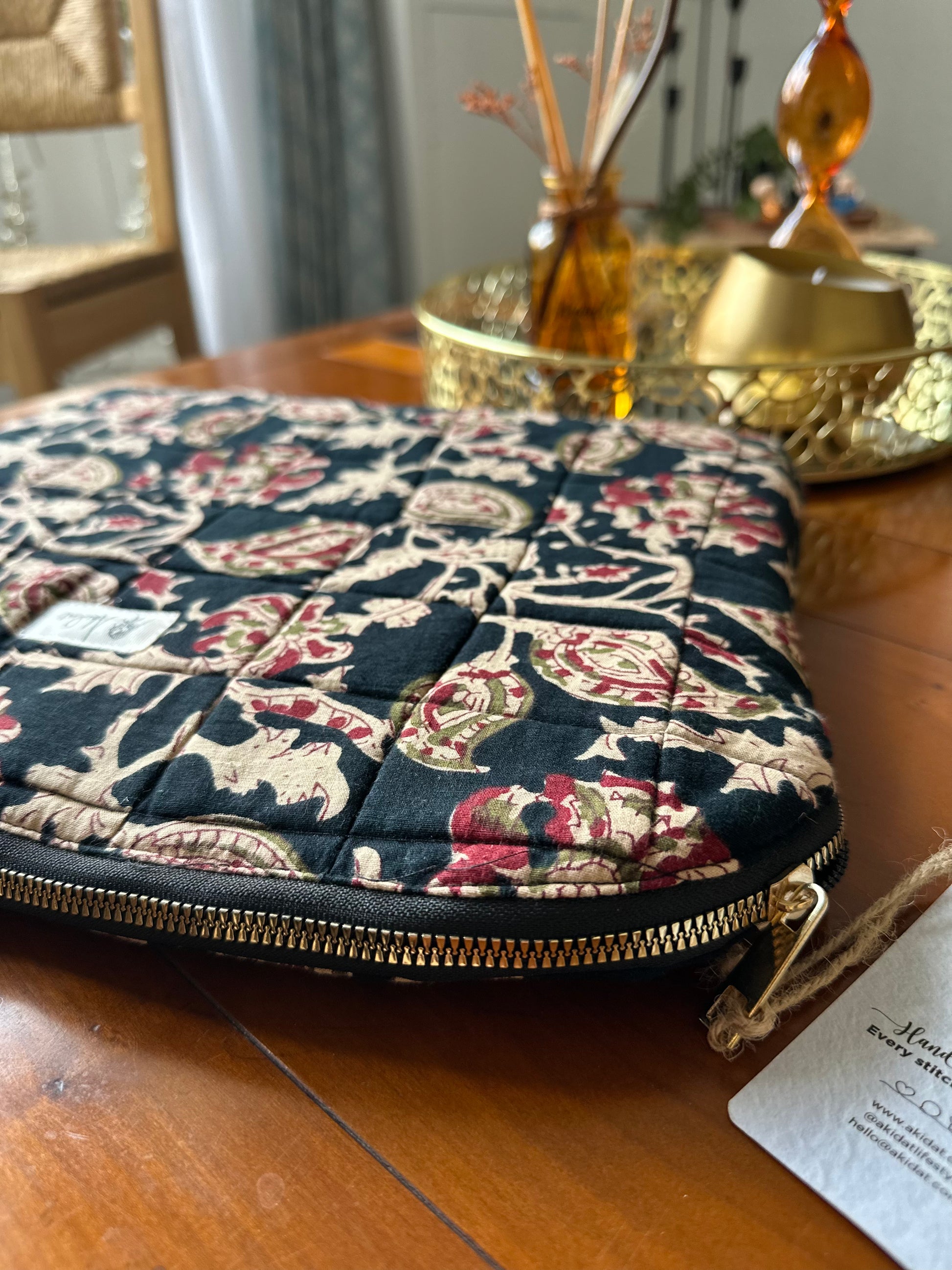Ebony Kalamkari Printed Handmade Zipper Laptop Sleeve