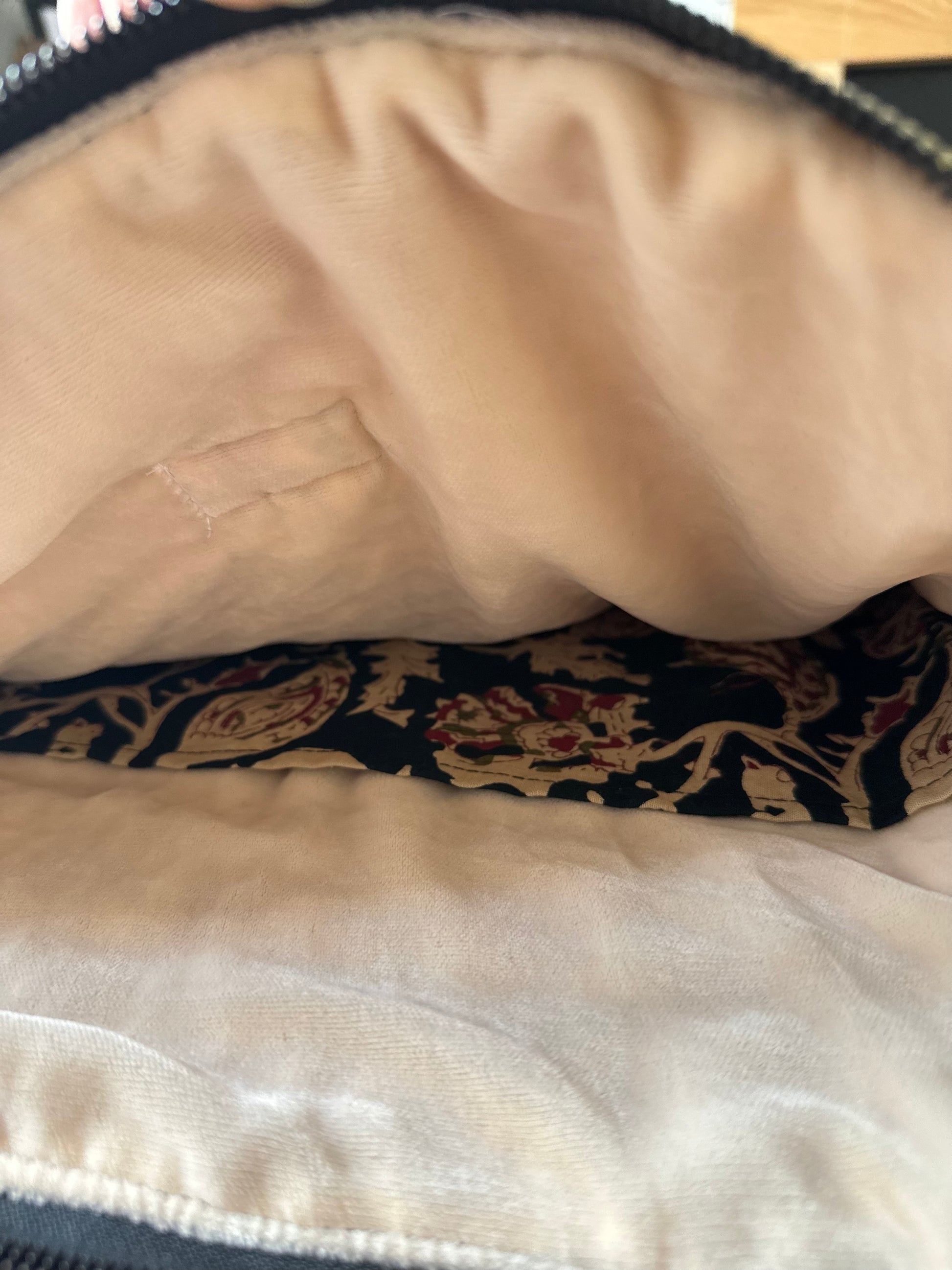 Material: Premium quilted cotton fabric with traditional black and brown Kalamkari floral print; padded inner velvet lining for added protection.