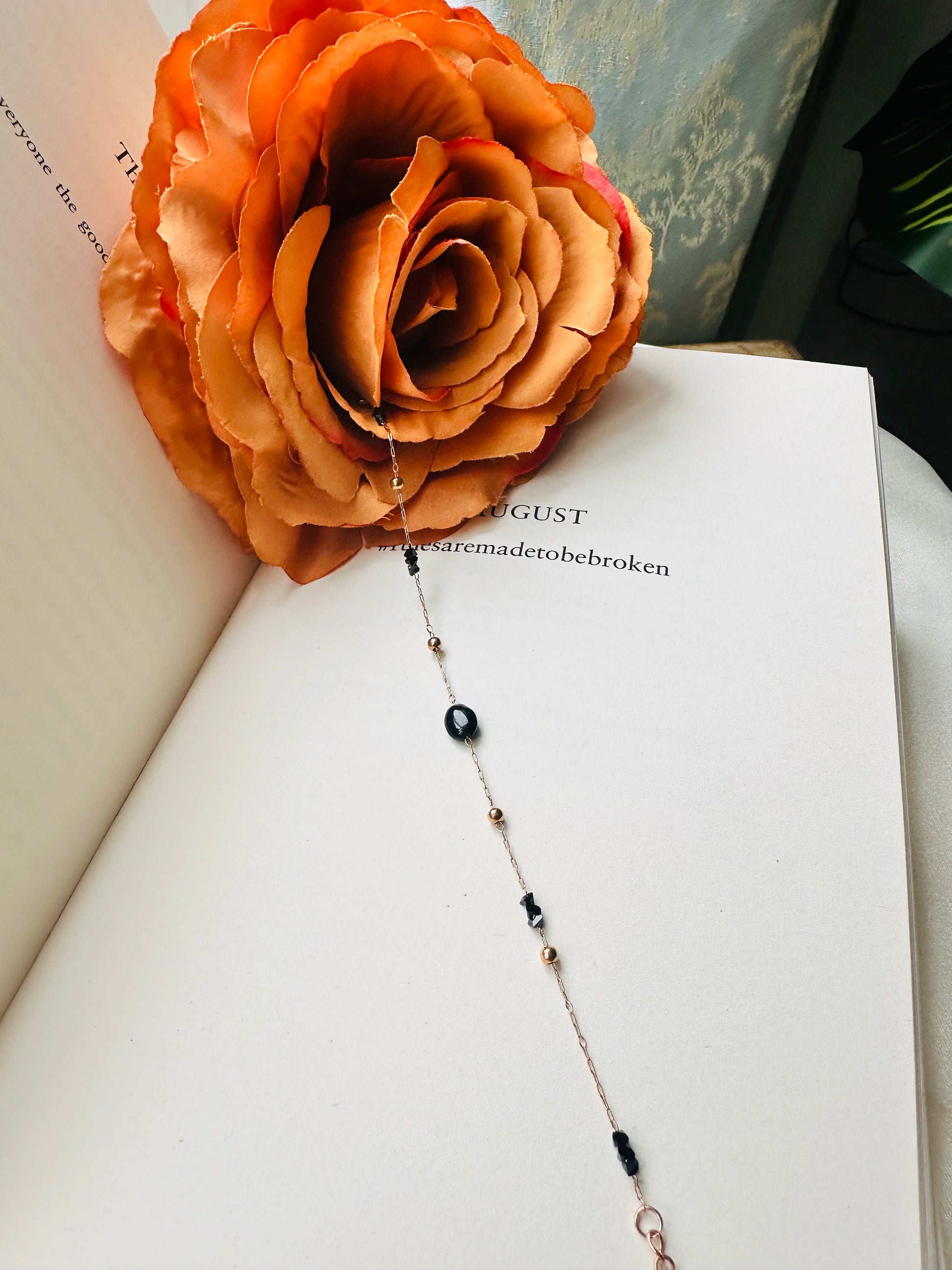 The interplay of the deep black bead and the warm rose gold chain creates a captivating contrast, while the golden motifs and crystals add a touch of radiant sophistication. Ideal for adding a touch of elegance to any outfit, the Eclipse Elegance Bracelet effortlessly transitions from day to night, making it a versatile addition to your jewellery collection.