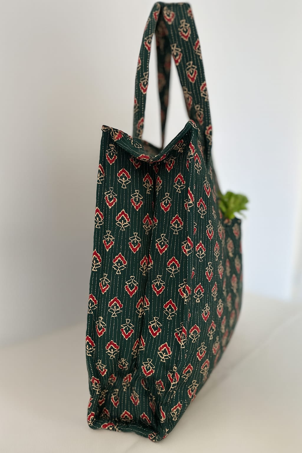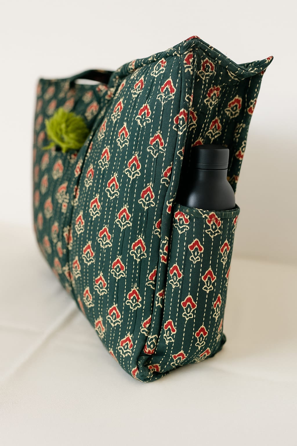 Ignite your everyday style with the Forest Flame, a striking handmade shoulder bag that blends bold design with practical craftsmanship. Made from soft, durable cotton in deep forest green, this artisan-crafted bag is adorned with fiery red floral motifs created using traditional Bagru block printing. The print, reminiscent of flames dancing from wood, is further enriched with delicate Kantha style threaded work, adding layers of texture and heritage.