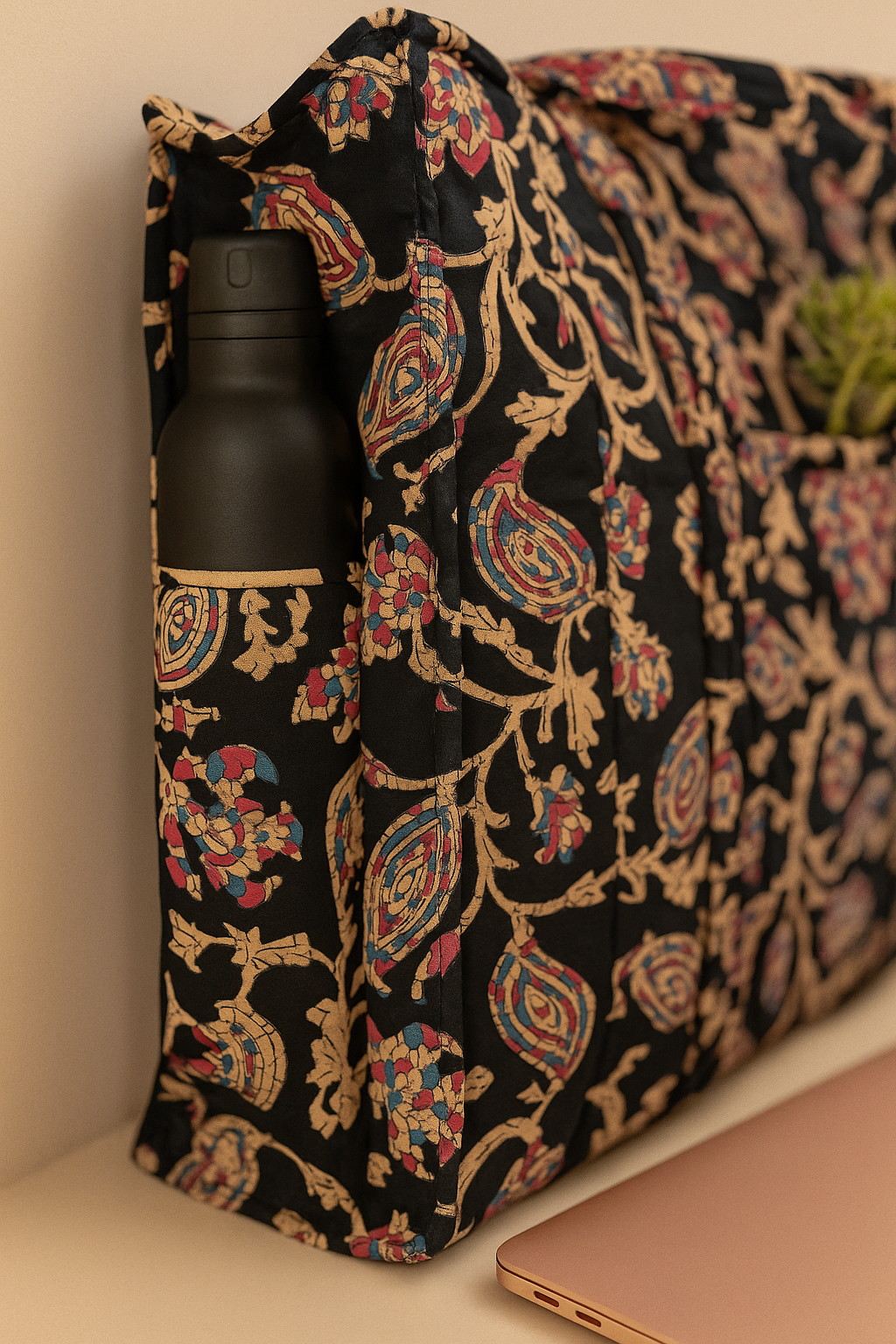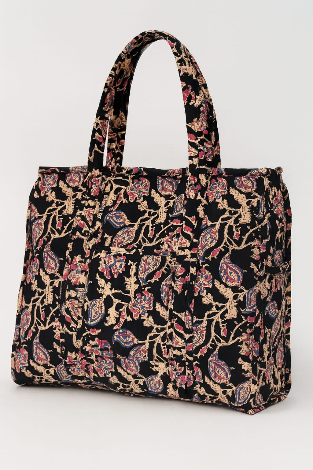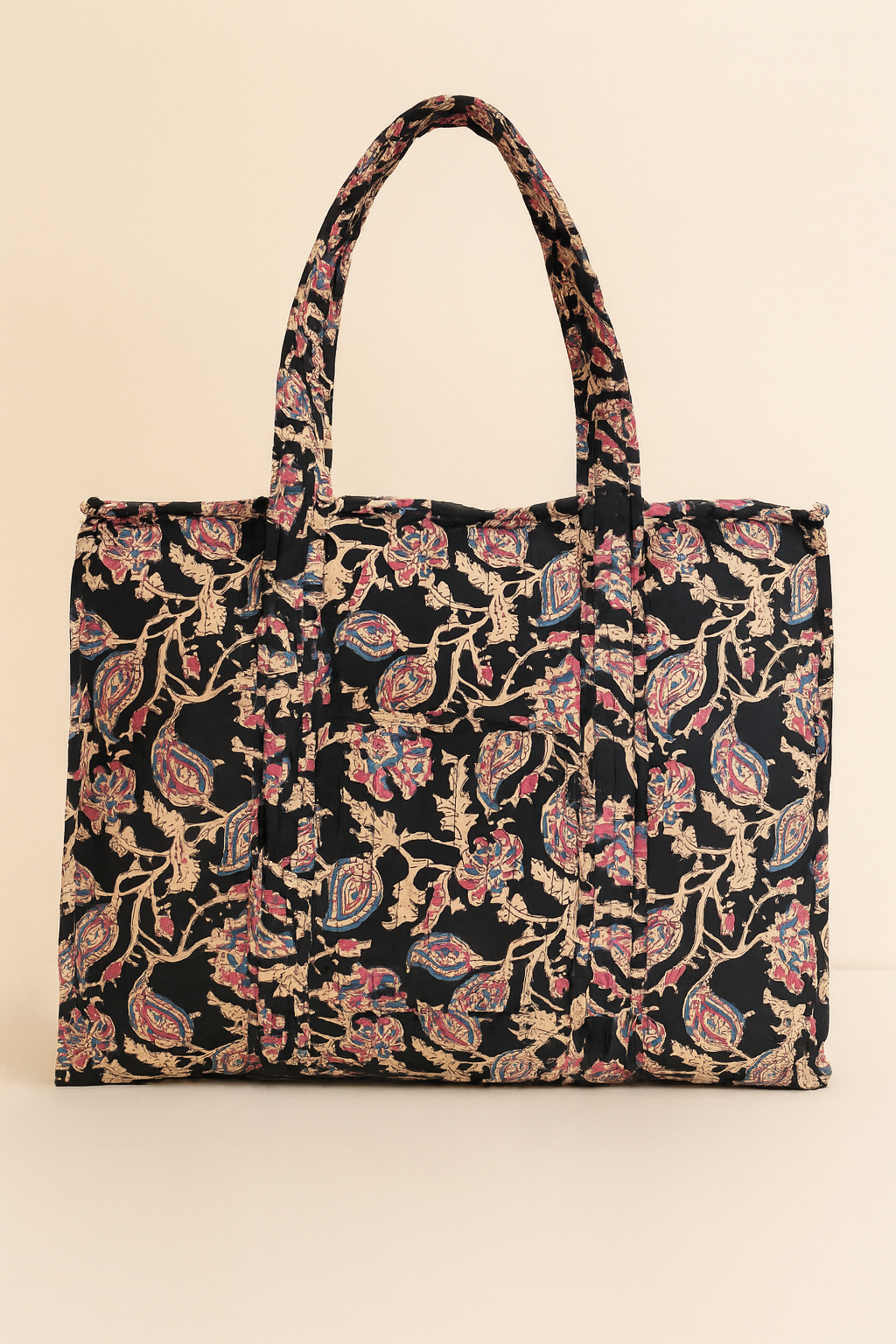 Elevate your everyday essentials with the Liana Handmade Zipper Shoulder Bag, a perfect blend of tradition and practicality. Crafted on a rich black cotton base, this bag features a stunning Kalamkari floral print with delicate beige floral creeper patterns accented by subtle hints of pink and blue, creating a timeless, elegant look.