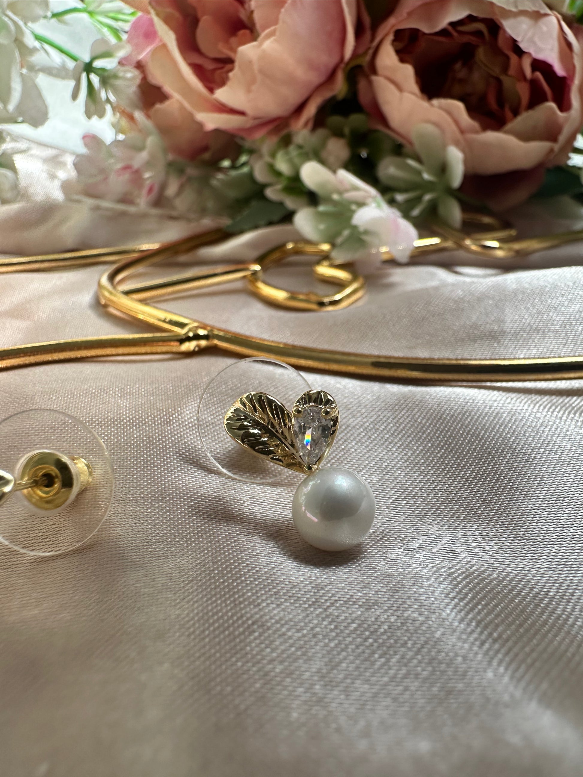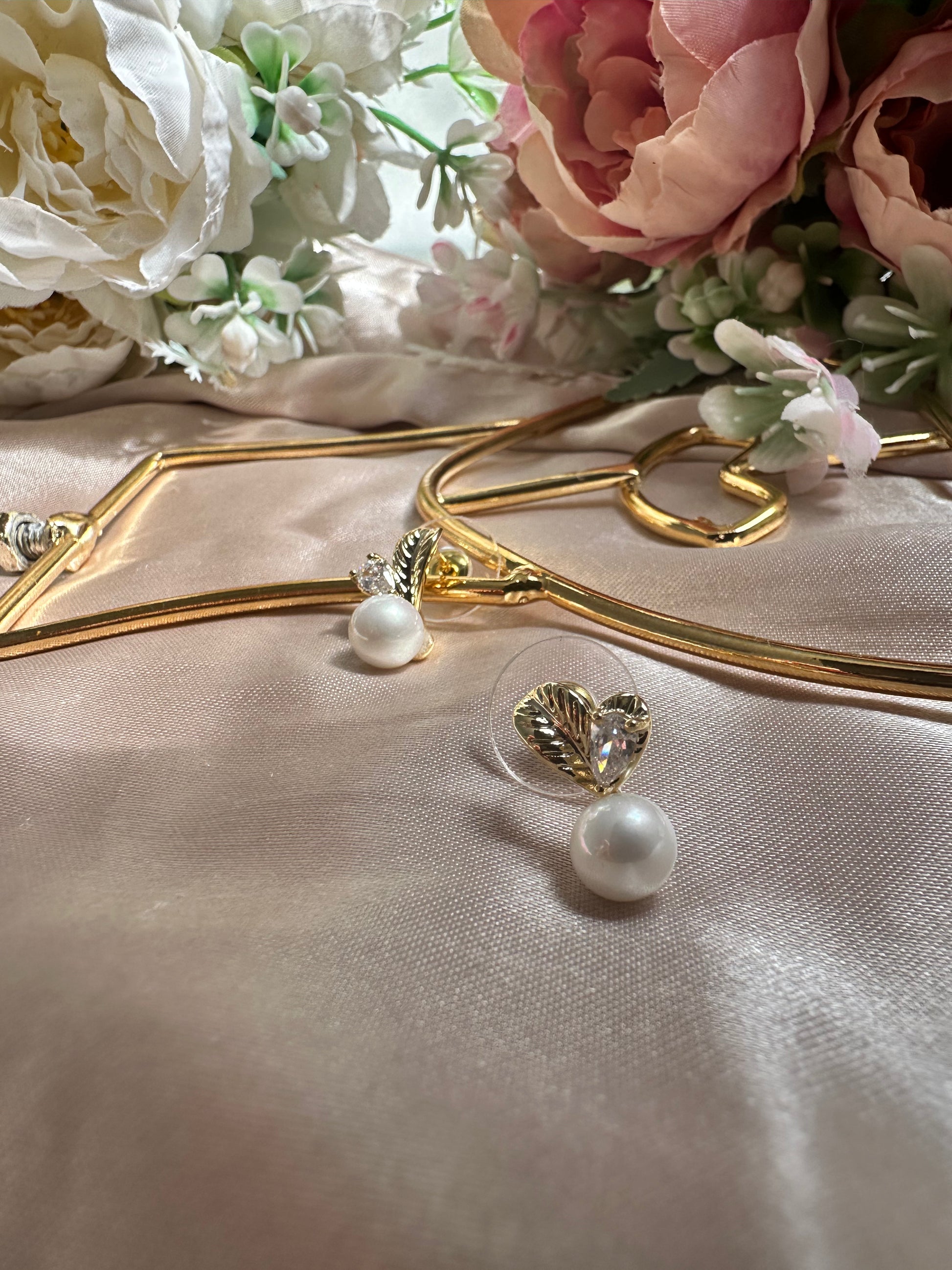 Beneath the heart, a lustrous pearl dangles gracefully, creating a sophisticated contrast with the golden metal and the shimmering crystal. Perfectly balanced in design, these stud earrings are an exquisite accessory for both everyday wear and special occasions.