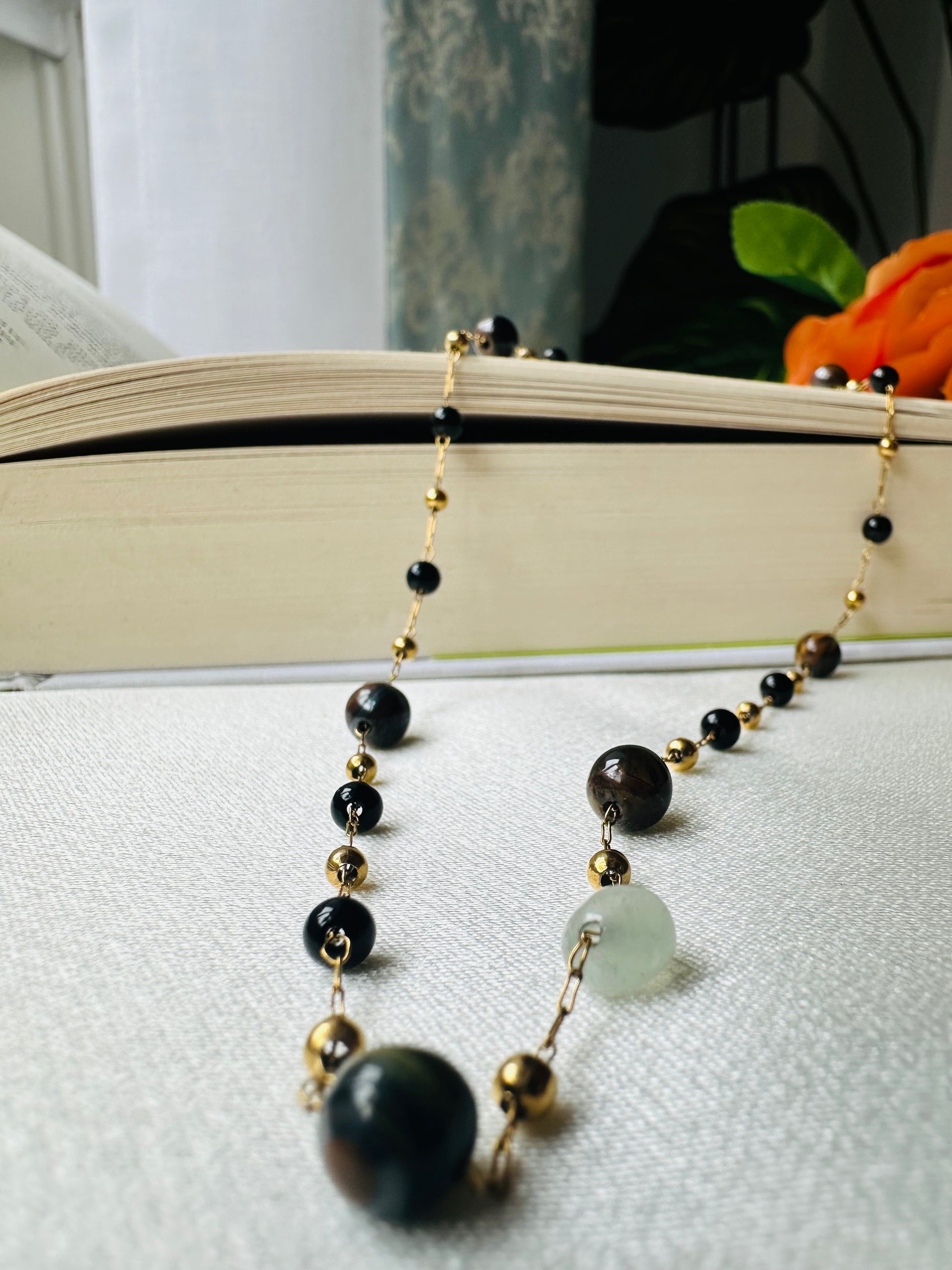 Introducing the Marble Dot Beaded Gold Chain Necklace—a masterpiece of modern elegance and artistic flair. This striking necklace features a stunning interplay of marble-shaped beads in rich bronze and deep black hues, each thoughtfully varied in size to create a captivating visual rhythm. Interspersed among these sophisticated marble beads are delicate, tiny golden motifs, meticulously placed to infuse a touch of luxury and refinement.