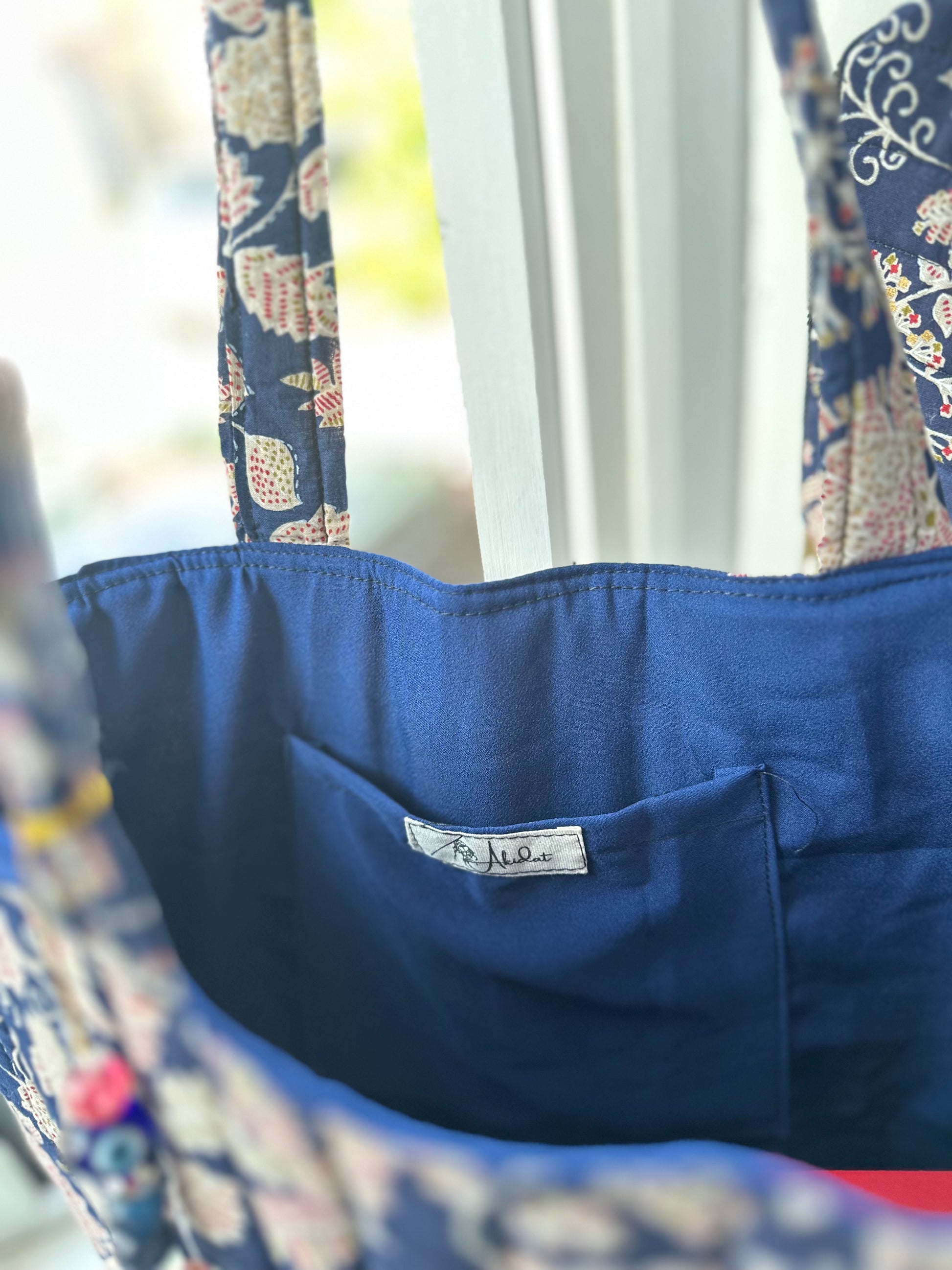 Step into timeless elegance with the Midnight Meadow Handmade Tote Bag, a beautifully quilted carryall that blends traditional craftsmanship with modern function. This artisan-crafted bag features a bold, floral block print in soft blush tones on a deep navy base—invoking the serene charm of a moonlit meadow.