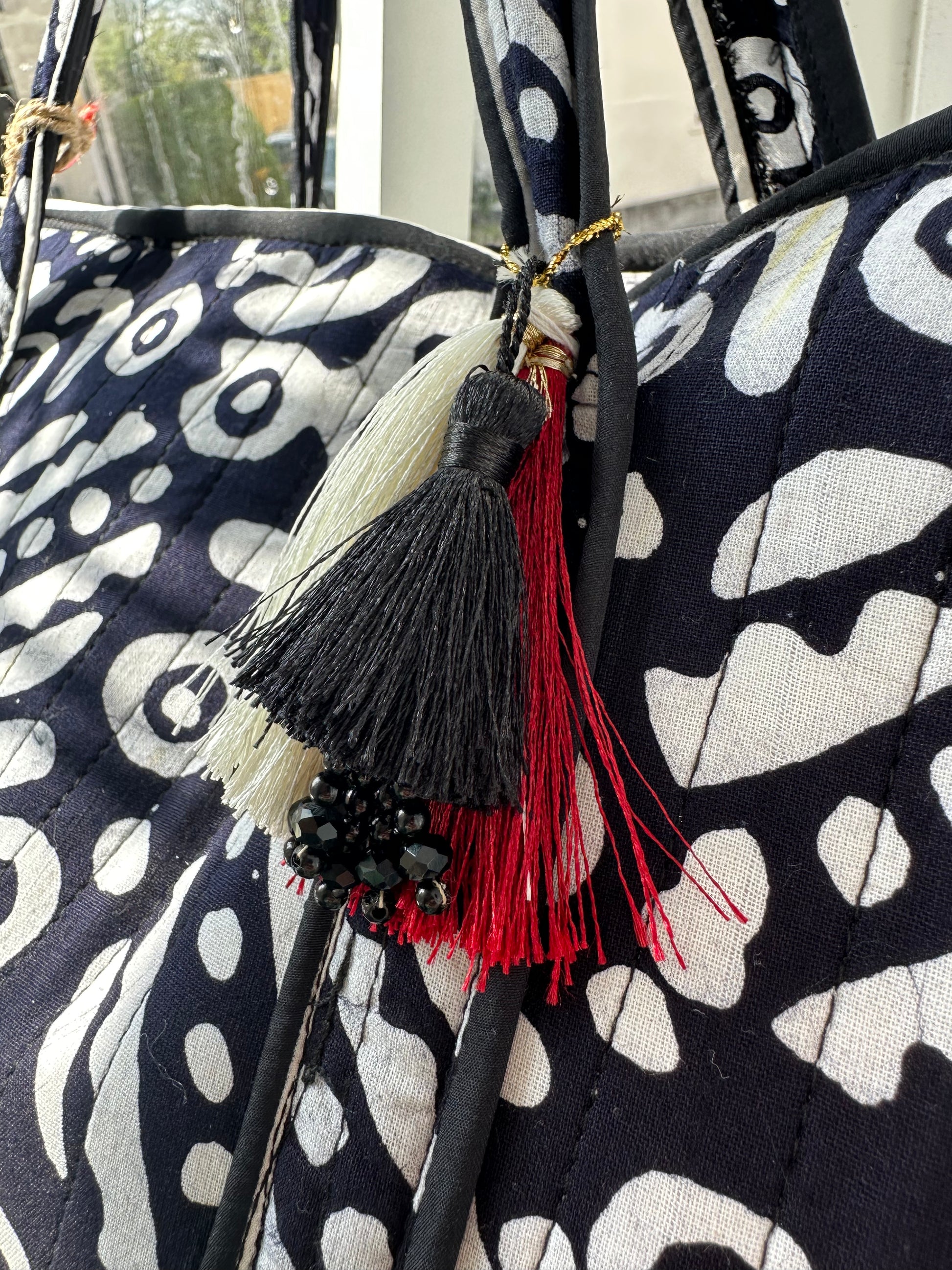 Monochrome Maze Handmade Zipper Shoulder Bag with Tassels