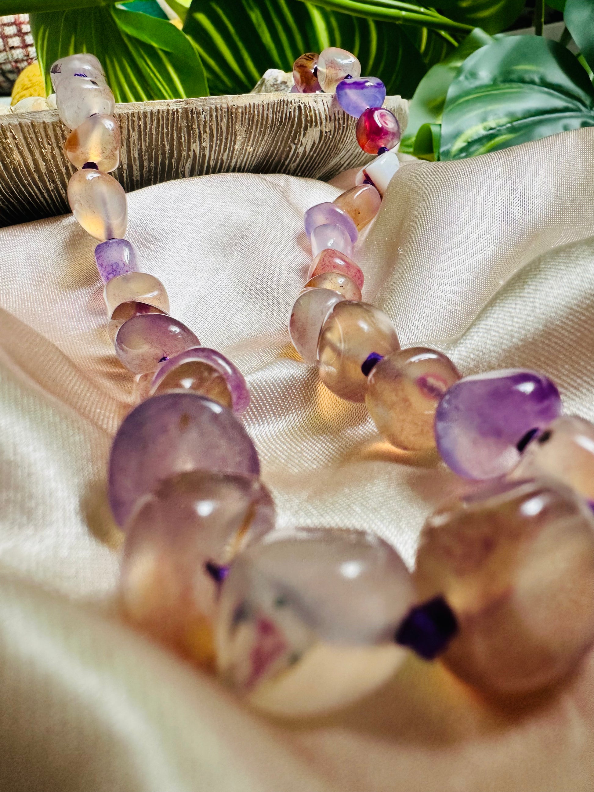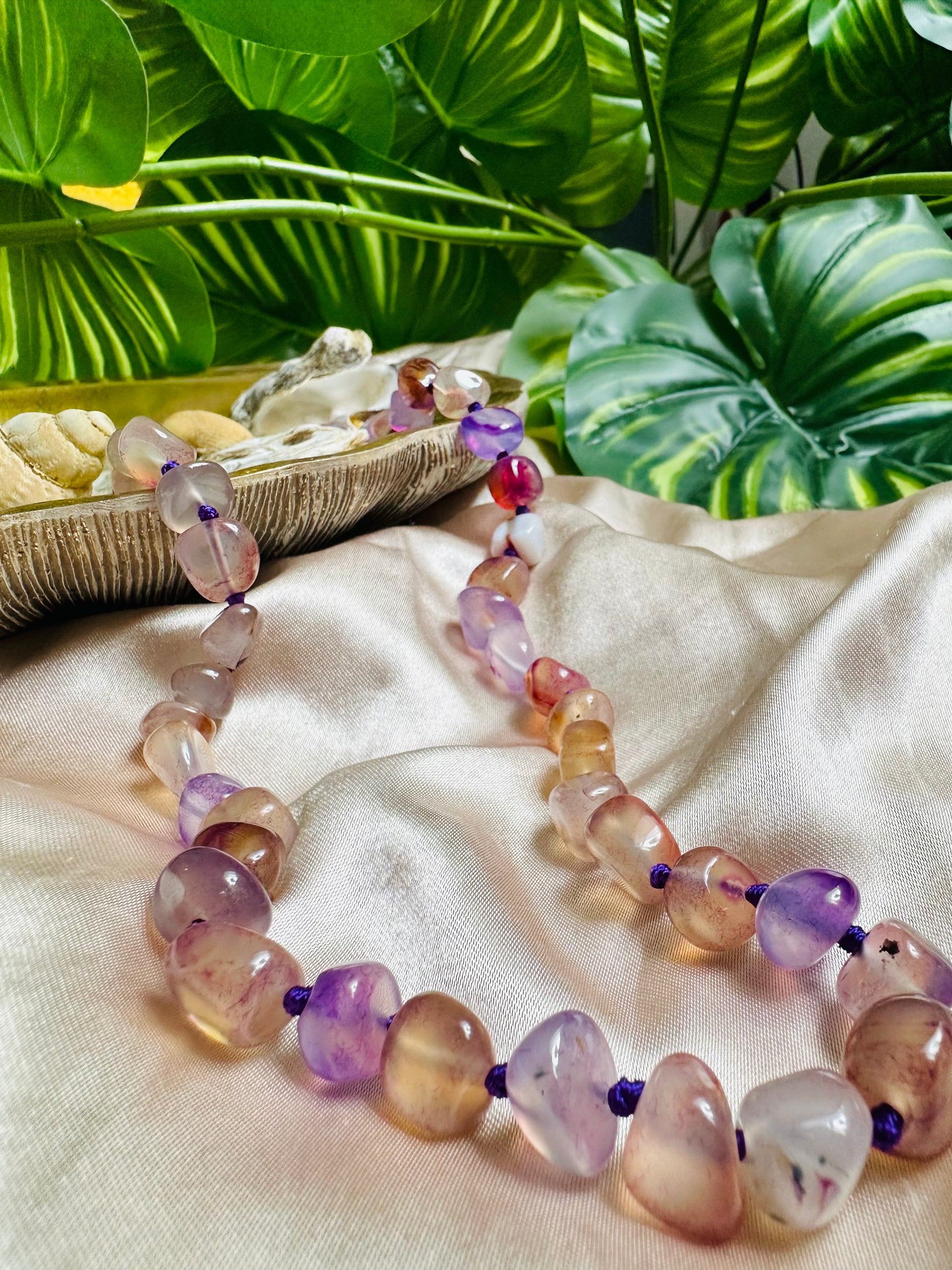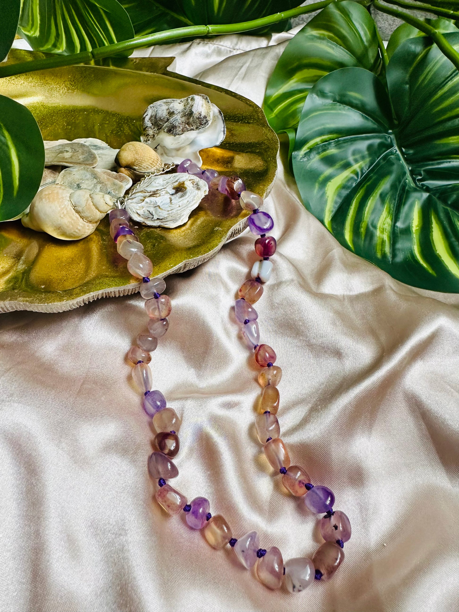 Step into a garden of enchantment with the Orchid Bloom Stone Necklace. This exquisite piece features a stunning array of stones in varying shades of purple and earthy tones, meticulously strung together on a rich purple thread. Each stone is carefully selected for its unique hue and natural beauty, creating a harmonious blend that mimics the delicate allure of an orchid in full bloom.