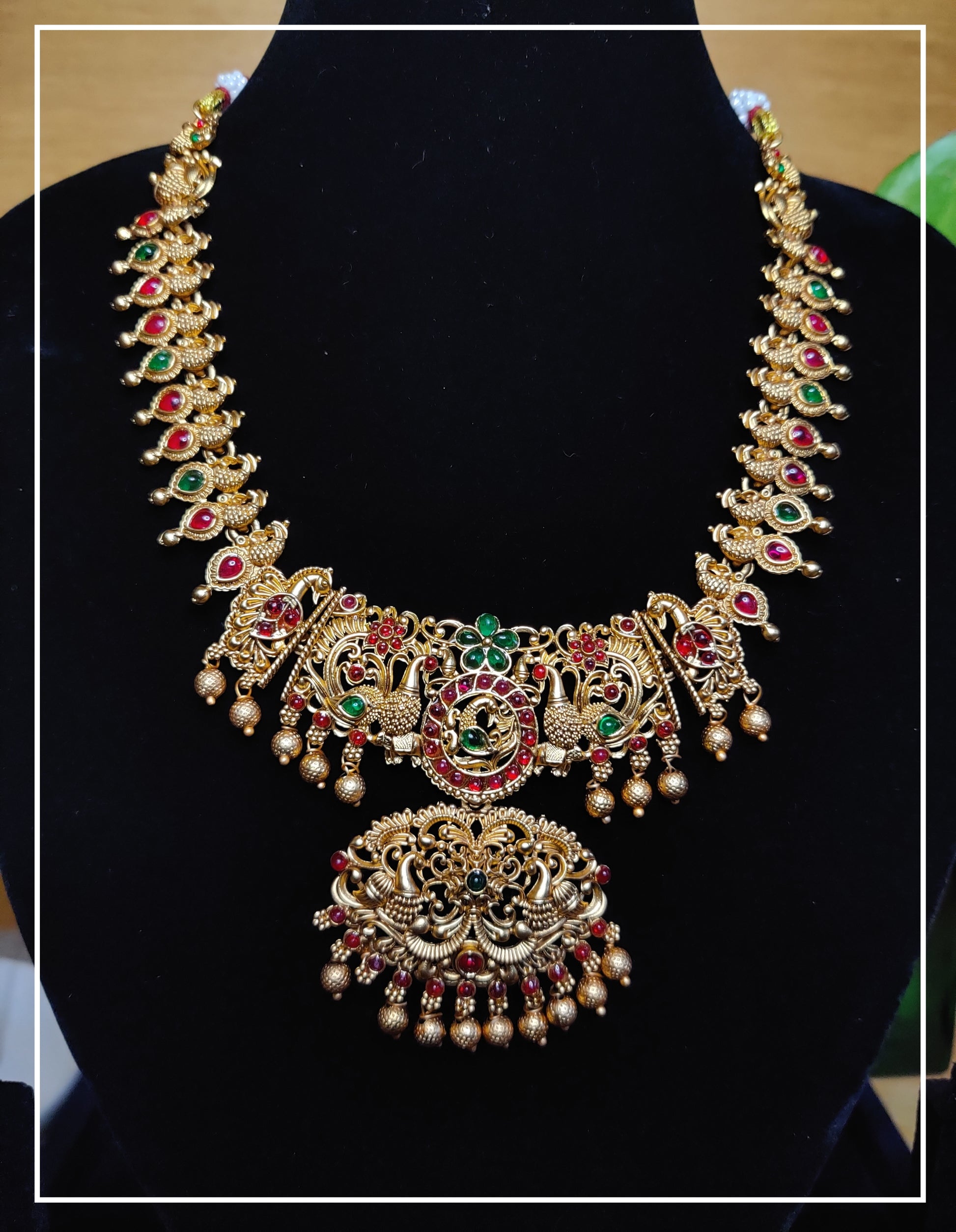 Peacock Alloy Gold Red and Green Stone Temple Bridal Jewellery Set with Jhumkas and 2 necklace