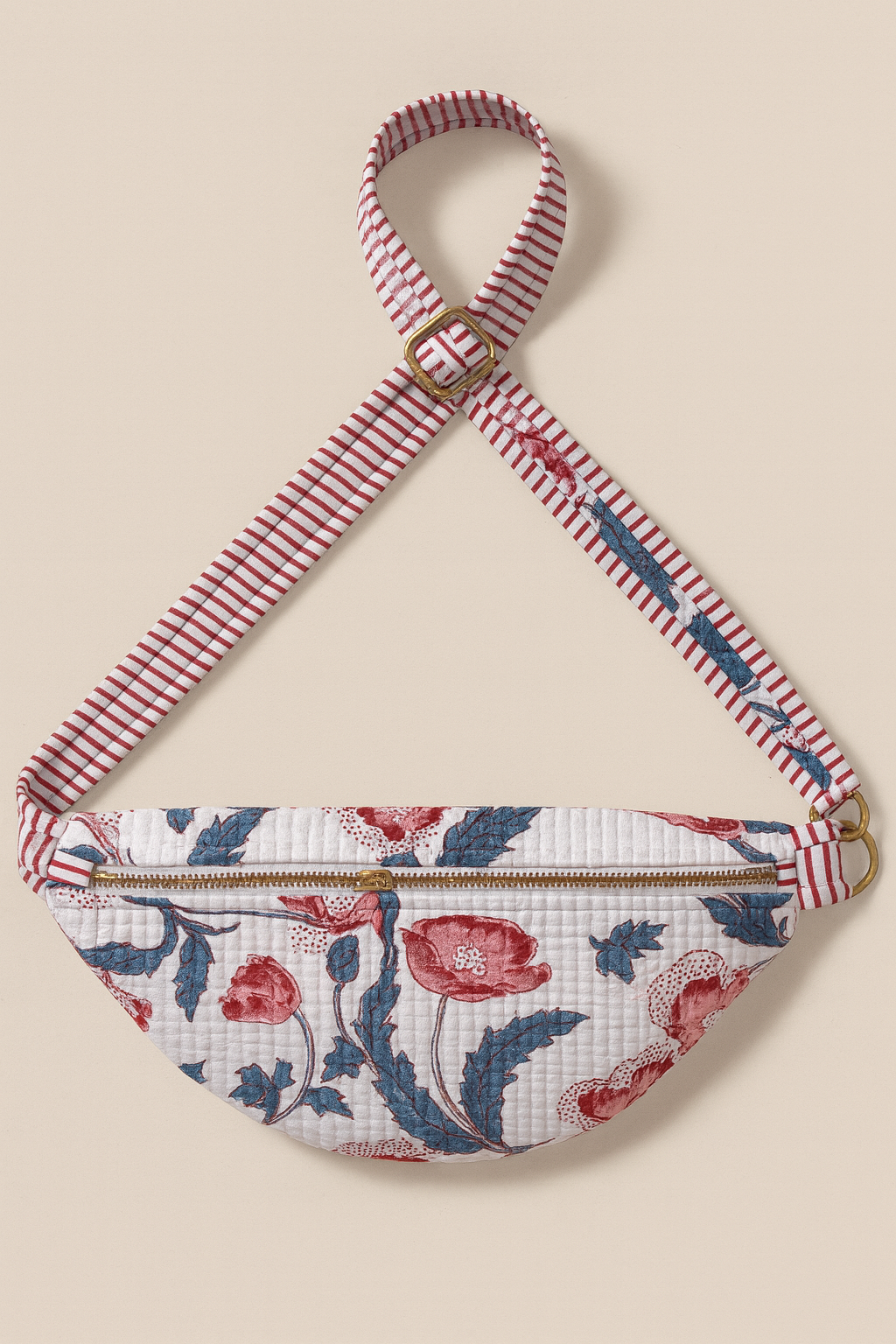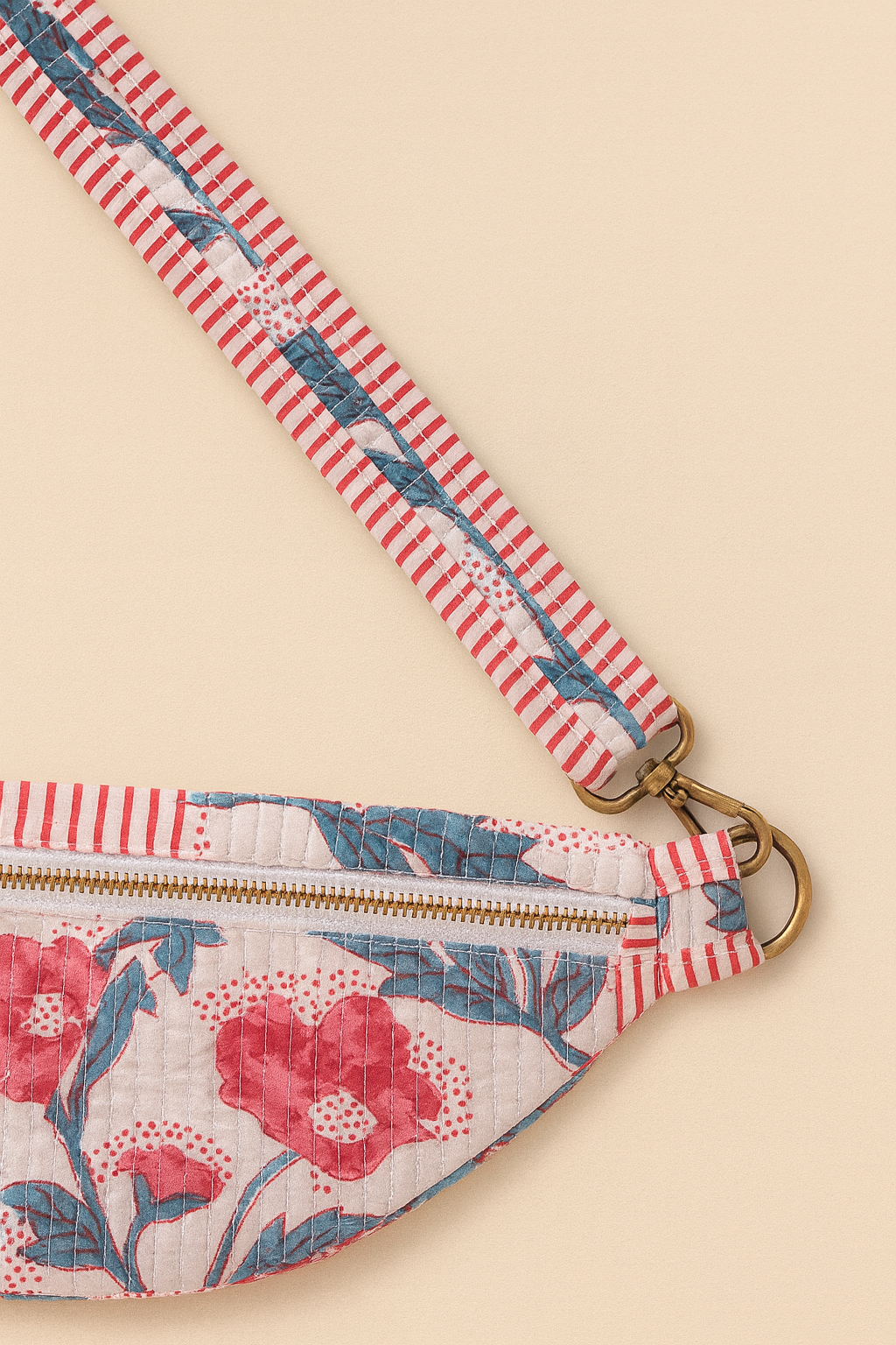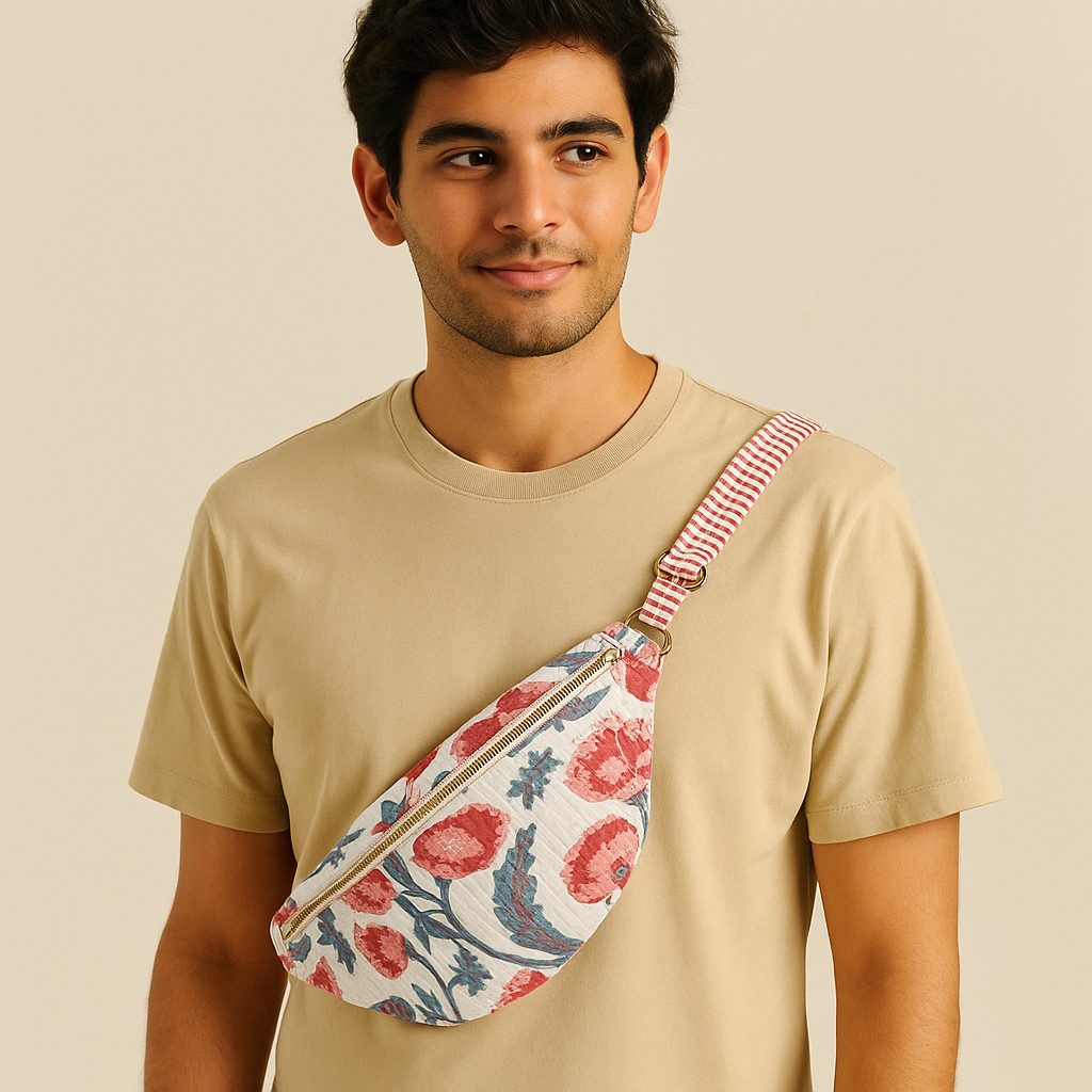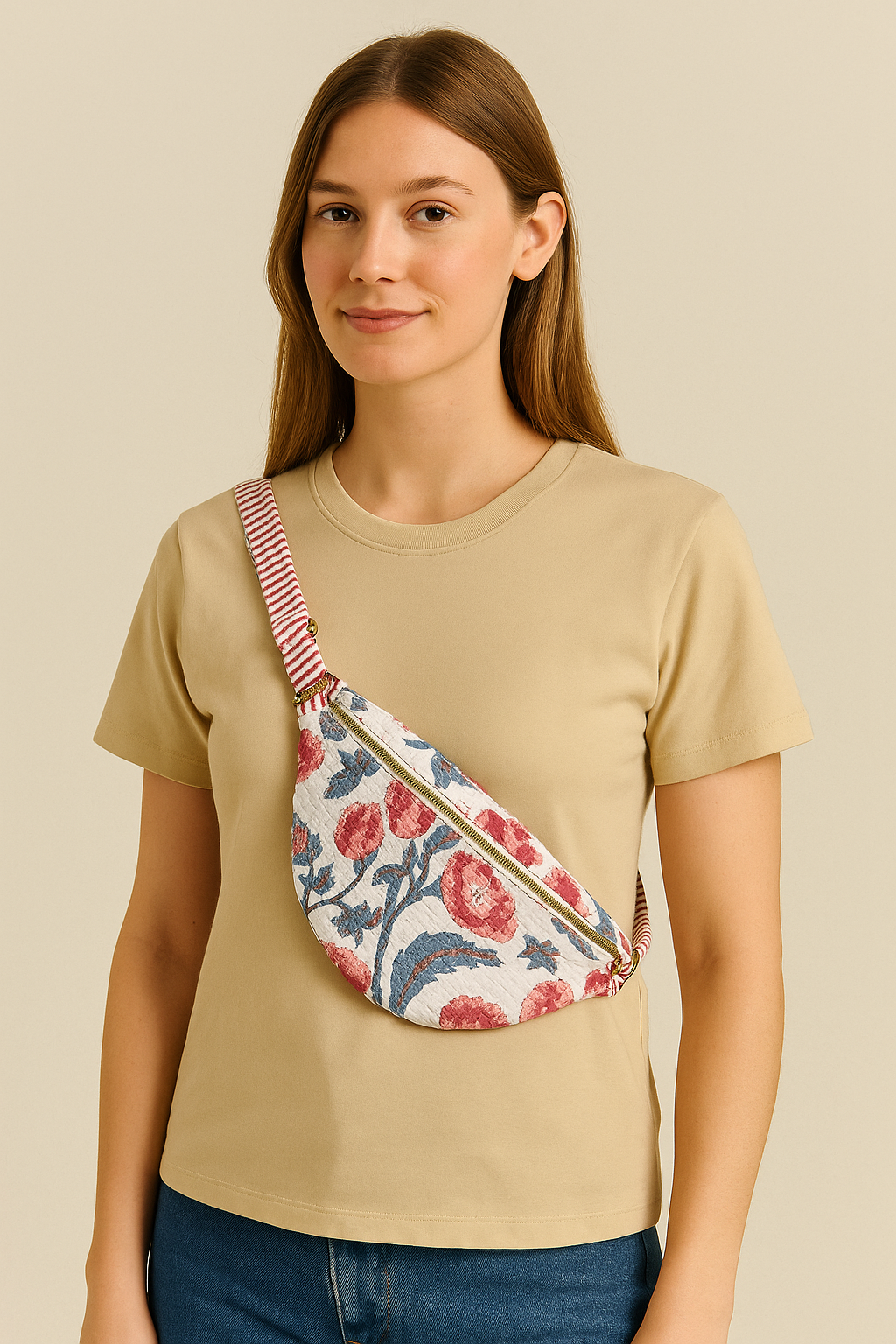 Step into timeless elegance with Zeba, a beautifully crafted fanny bag inspired by the lush, ornamental charm of Mughal gardens. “Zeba”, meaning beauty and grace, perfectly captures the spirit of this accessory, where tradition meets modern style. Featuring a delicate hand-block floral print in vivid red and deep indigo on soft quilted cotton, Zeba is as eye-catching as it is functional. The striped adjustable strap adds a playful contrast, while the spacious zippered compartment, lined with coordinating stripes, keeps your essentials secure and organised.