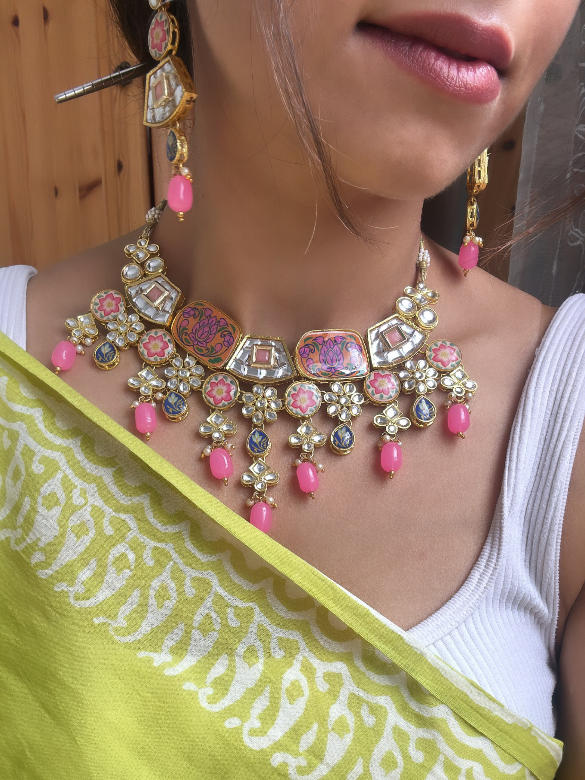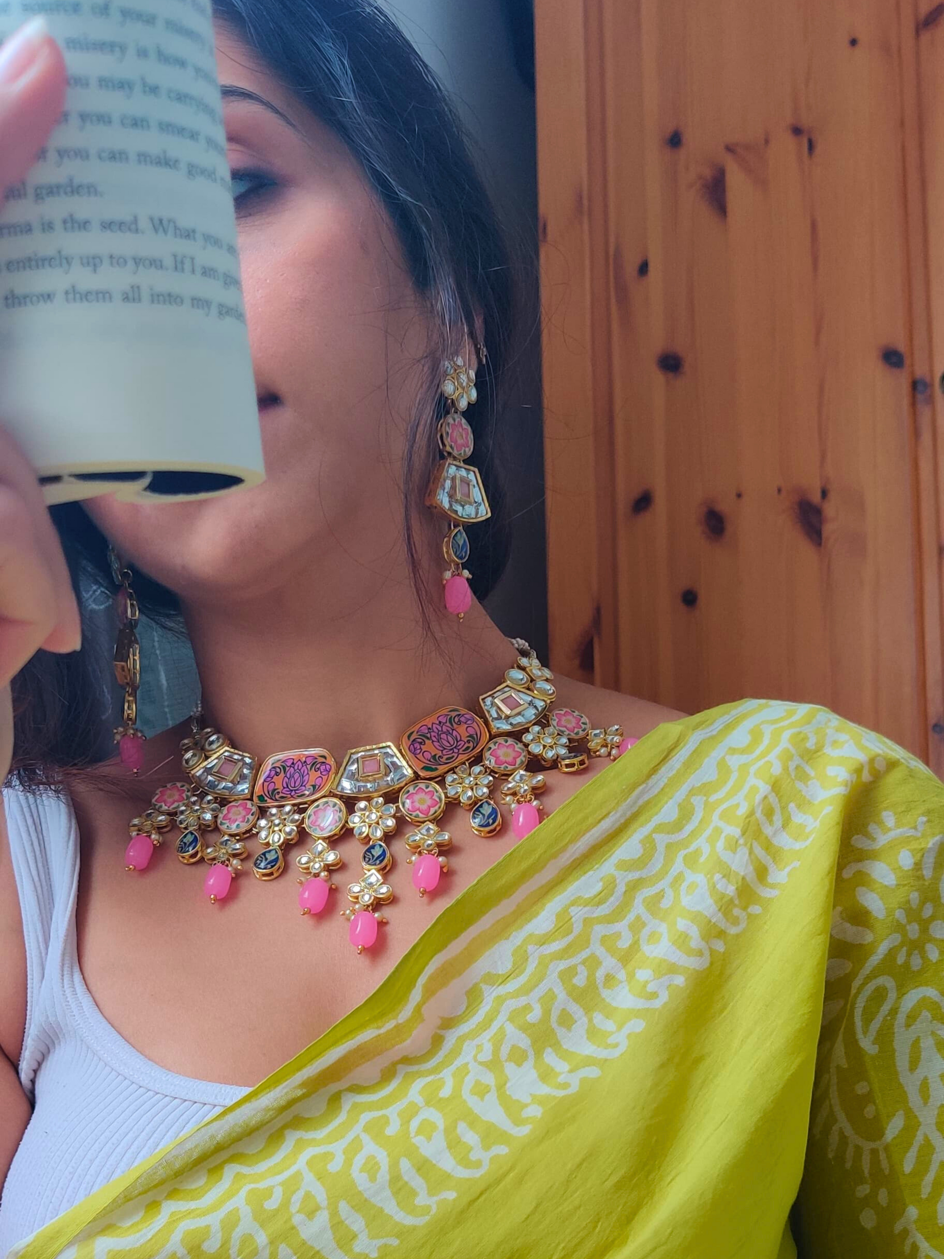 Wearing the Rose Blush Regalia Kundan Choker Set is an experience of stepping into a world of elegance and grace. It is the perfect accompaniment for a bride on her special day, a timeless piece for a grand celebration, or a statement of sophistication for any occasion.