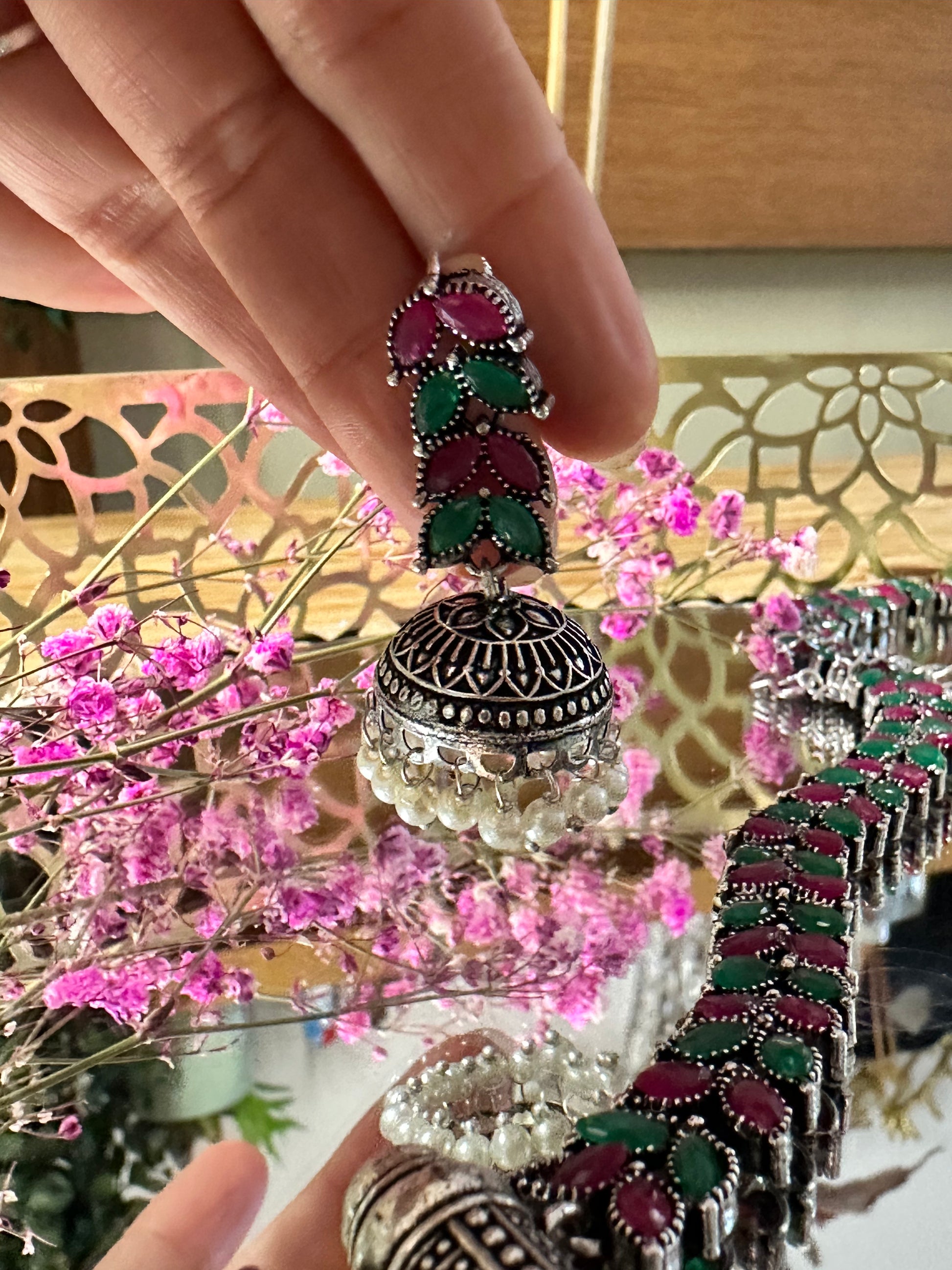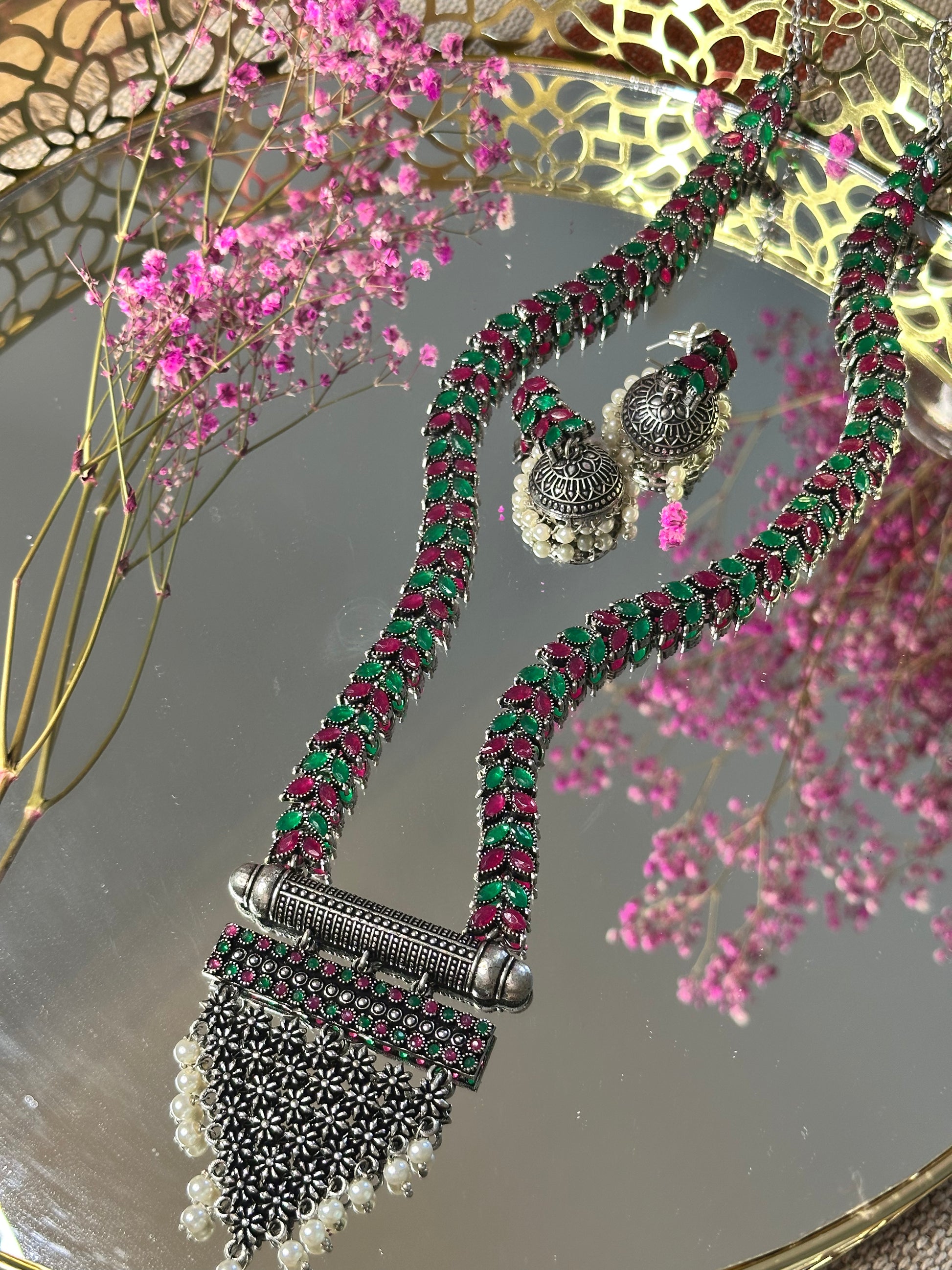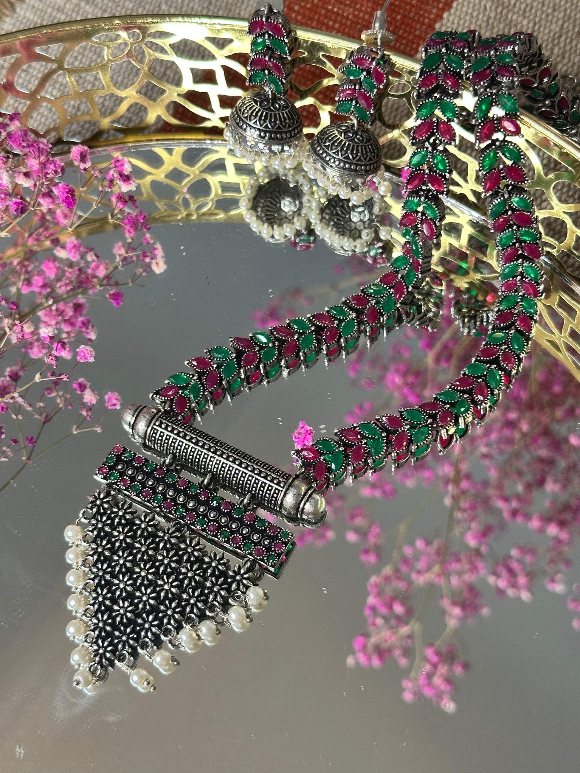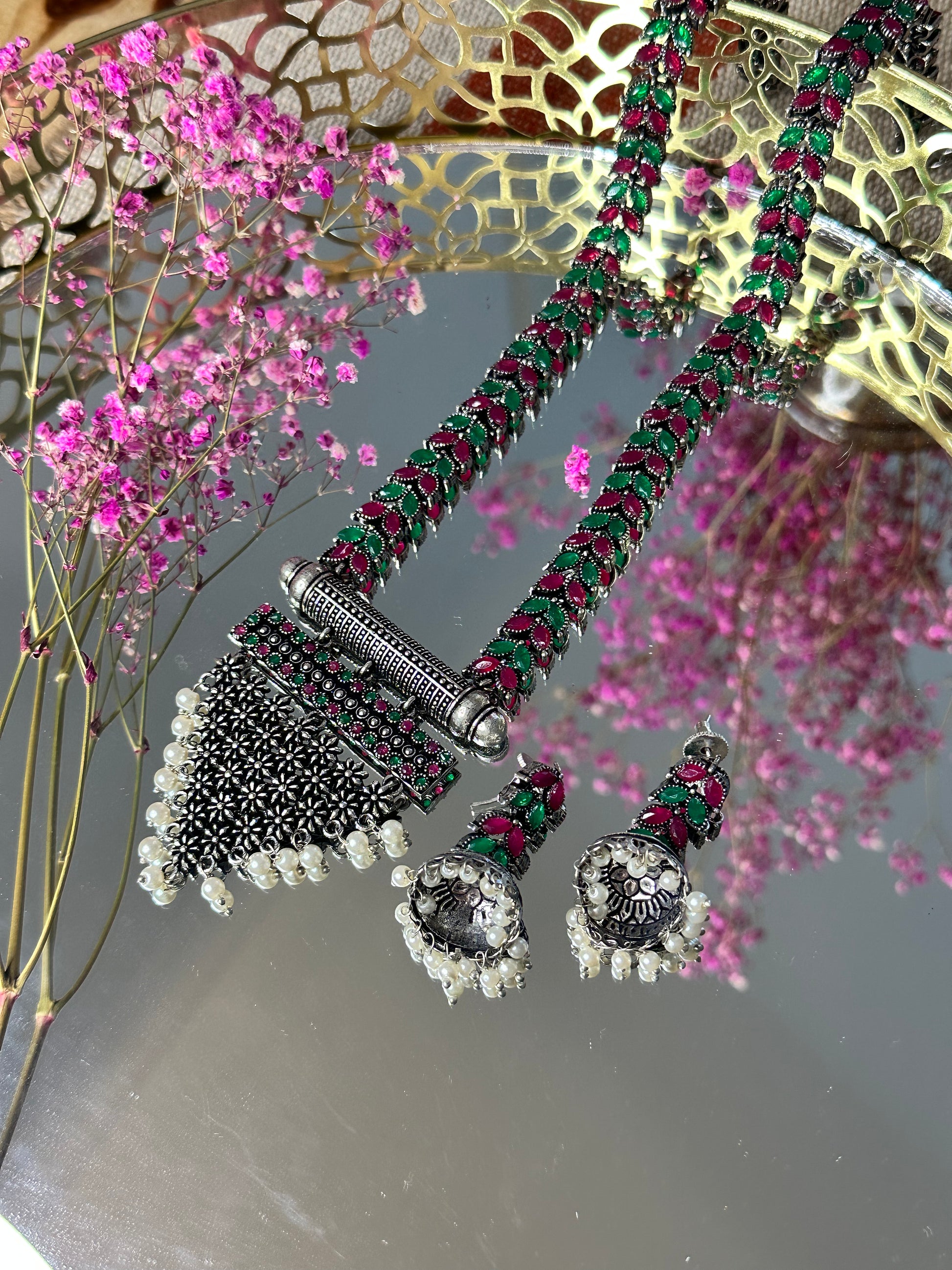 Elevate your style with the Royal Leaf Symphony Long Necklace Set, a perfect blend of nature's elegance and timeless beauty. This exquisite oxidised necklace features a stunning leaf-inspired design, adorned with vibrant red and green stones that exude regal charm. Pearls delicately hang from the intricate patterns, adding a touch of sophistication and grace to the piece.