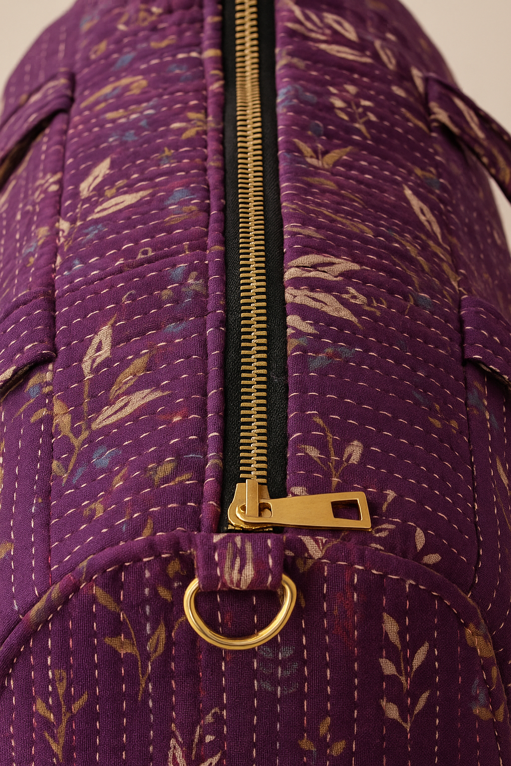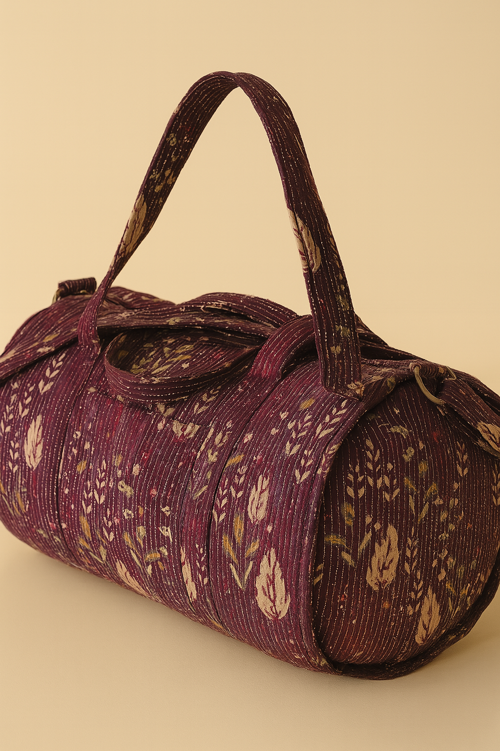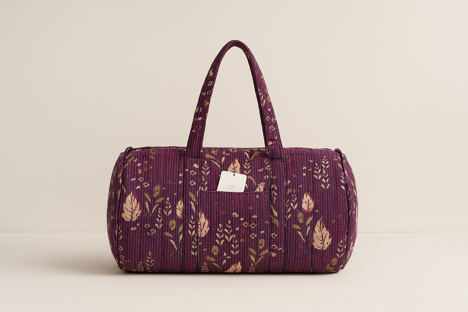 A soulful blend of elegance and utility, the Savannah Handmade Duffle Bag is where traditional craftsmanship meets everyday function. Handcrafted with precision and purpose, this charming duffle features a serene purple-pink base enriched with intricate beige floral quilted thread work, offering a tactile and visual celebration of artistry. Whether you're heading for a weekend escape or powering through a gym session, this bag moves with you, stylishly and sustainably.