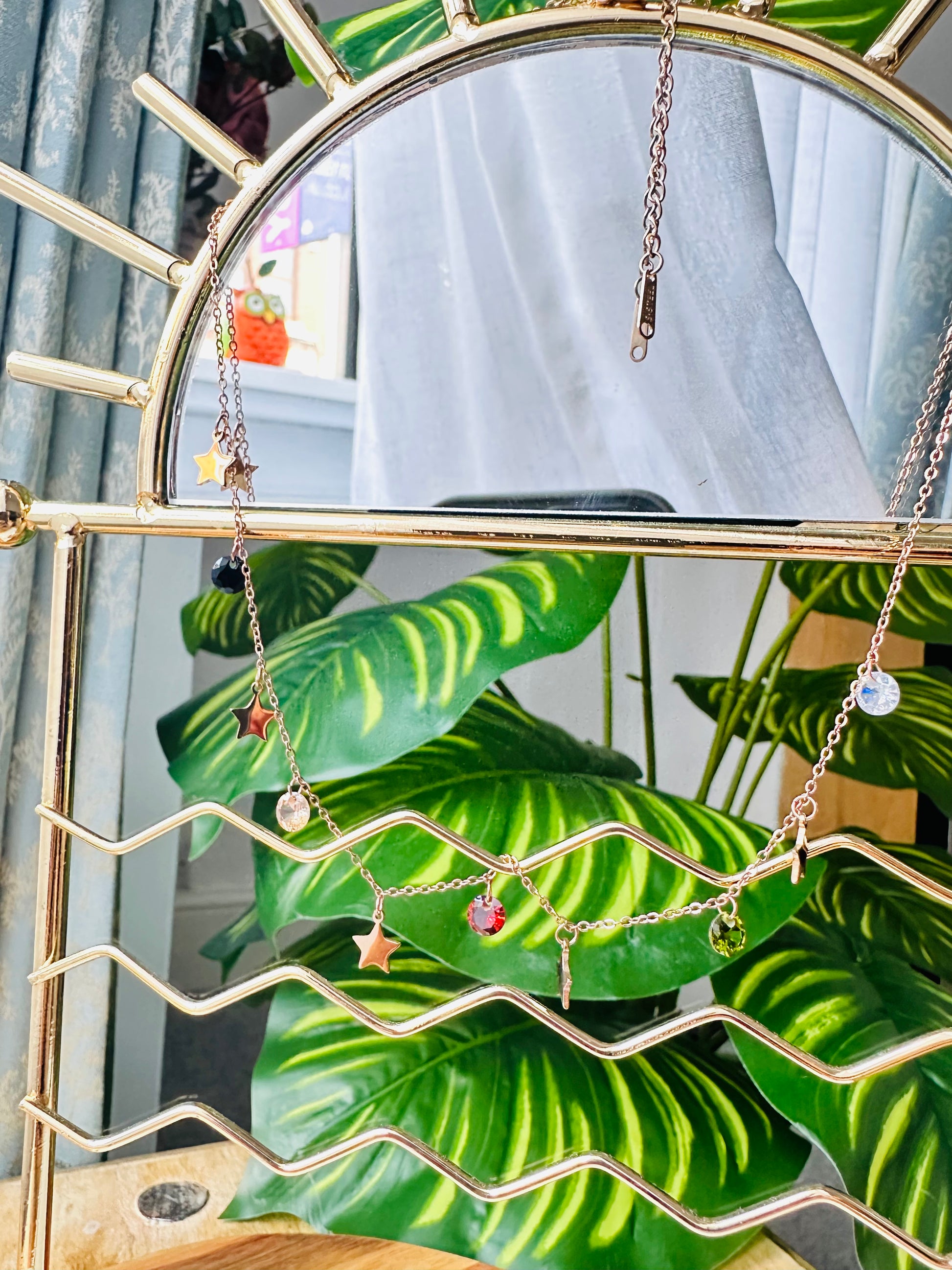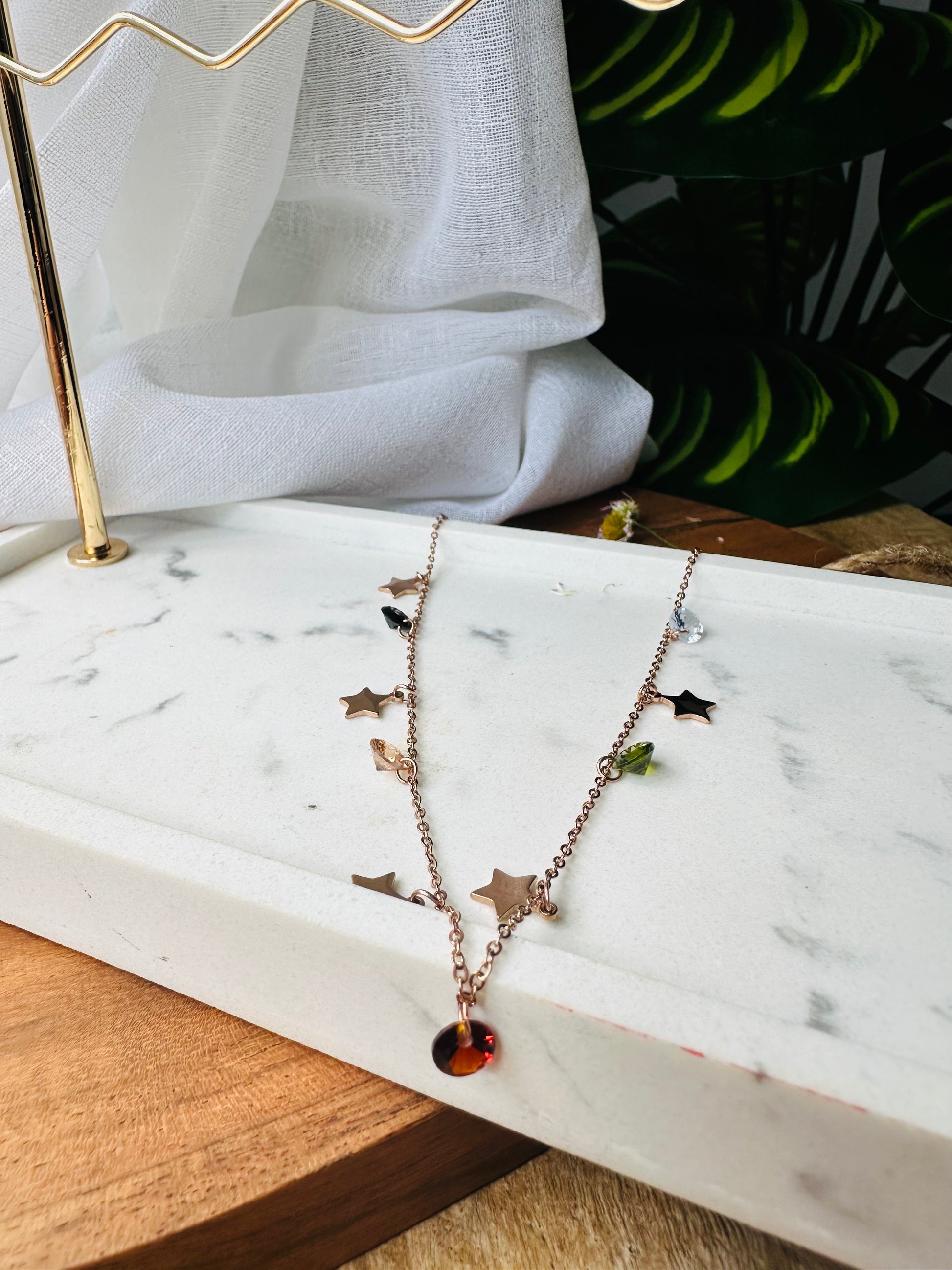 Elevate your style with the mesmerising beauty of the Stellar Spectrum Necklace, a true testament to celestial elegance. Crafted with alternating tiny golden stars and radiant stones of various hues, this necklace exudes a captivating allure that effortlessly complements any outfit.