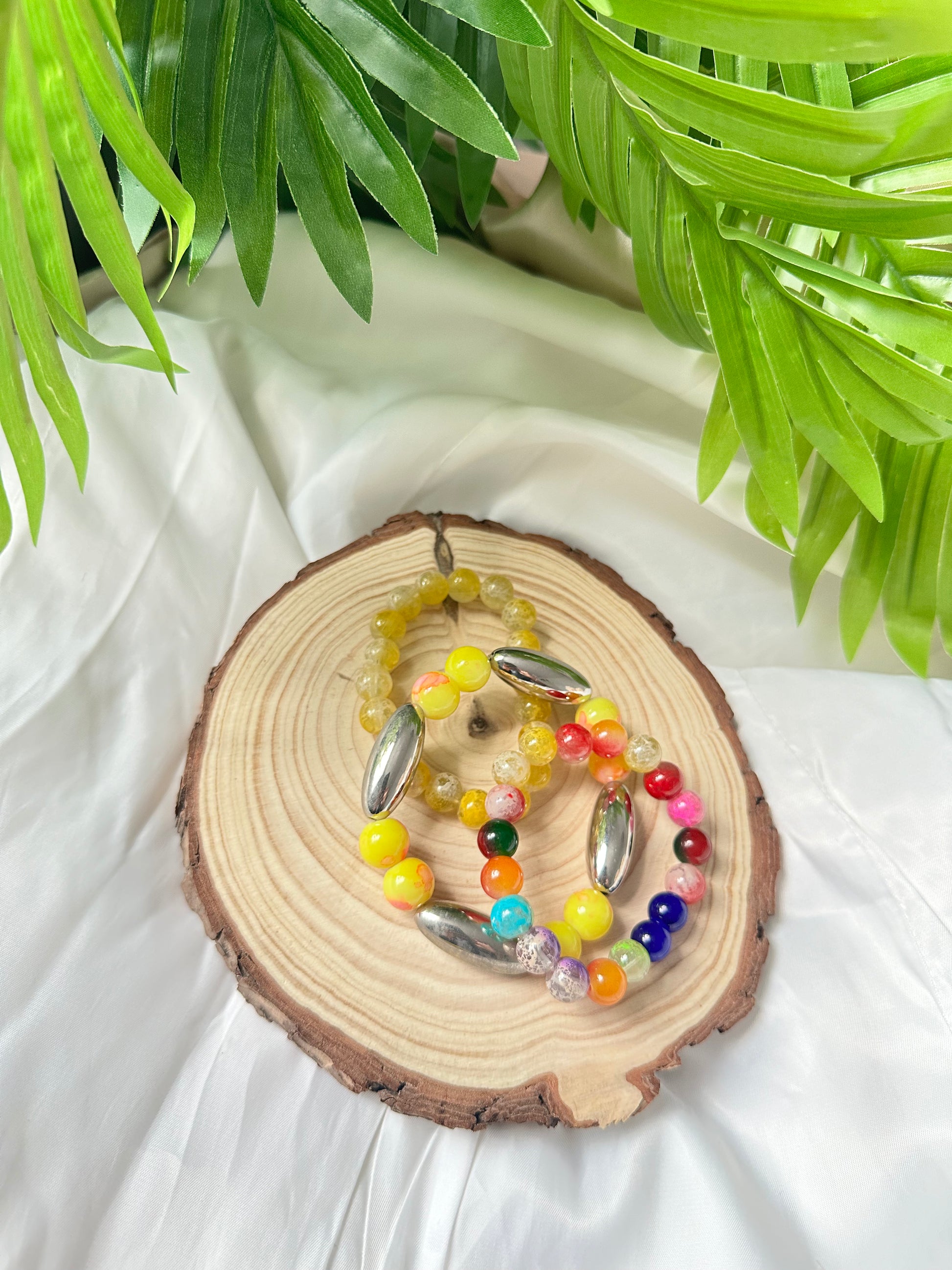Water-Coloured Orange and Yellow Mix Glass Stone Bracelet with Large Silver Beads: This statement piece combines the warm, vibrant tones of a sunrise with the sophistication of elongated metal beads.