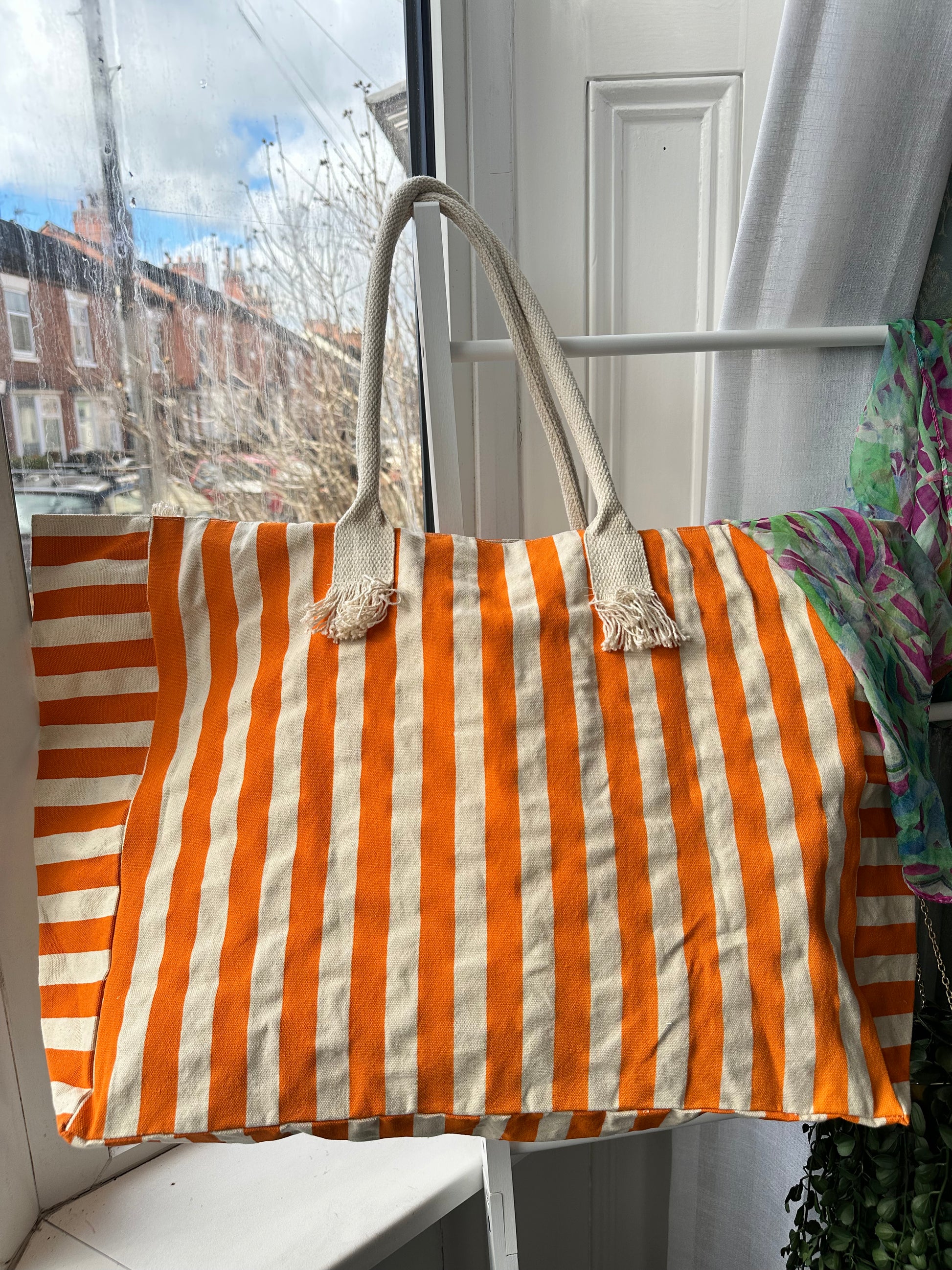Tangerine Cabana Cotton Oversized Striped Travel Bag with Fringed Edges
