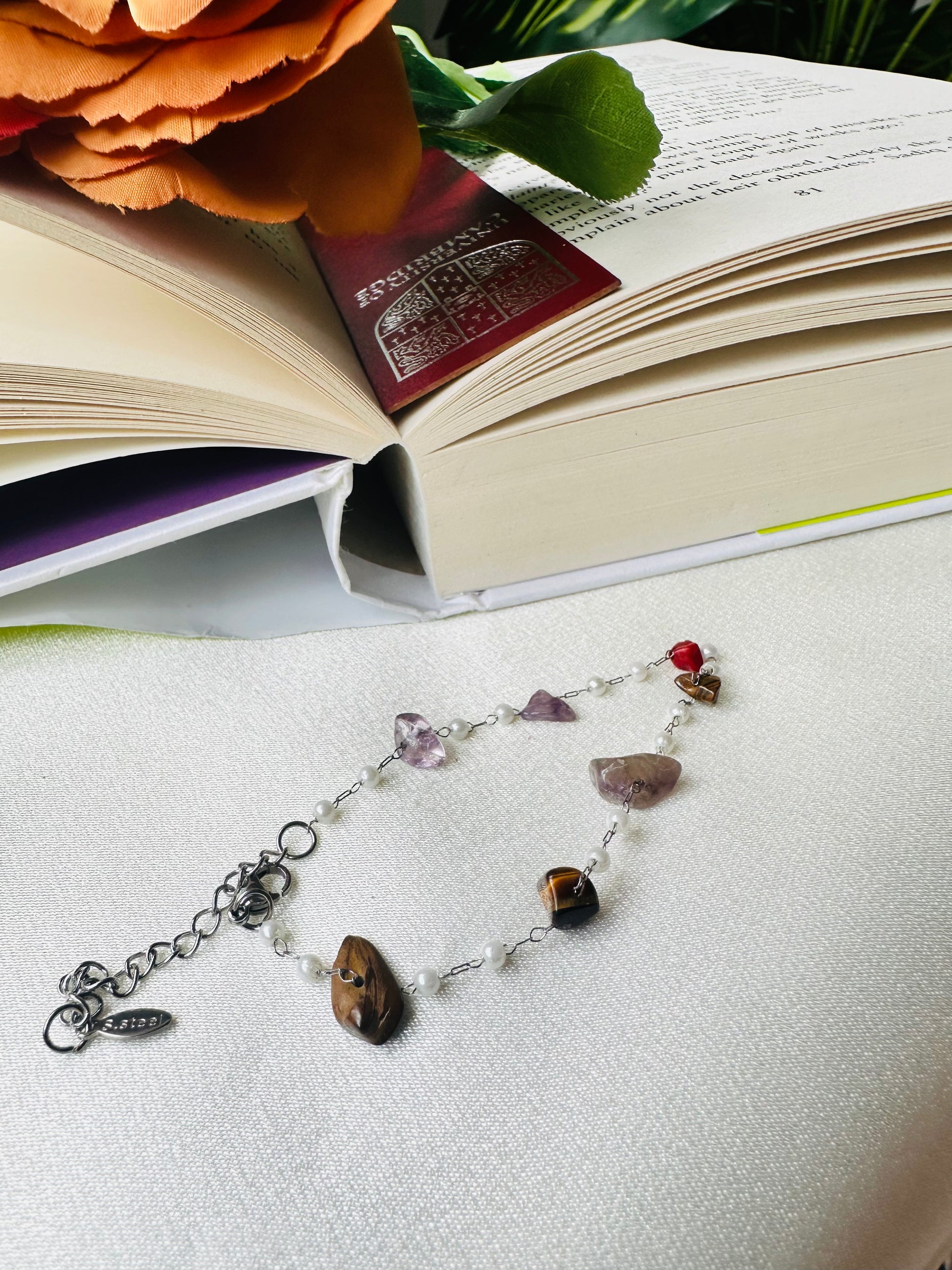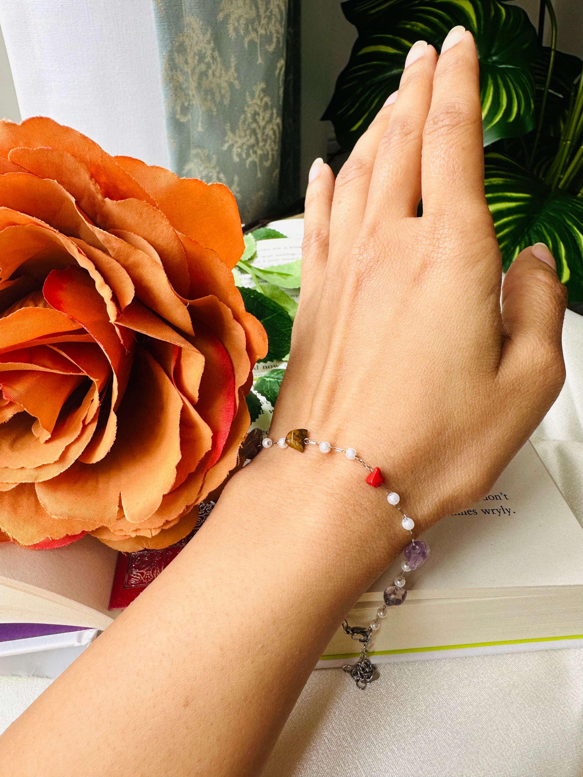 Embrace a spectrum of elegance with the Touch of Love Beaded Chain Bracelet. This exquisite piece features a meticulously crafted silver chain adorned with seven stunning stones in a harmonious array of colours, transitioning from rich browns to deep reds and vibrant purples. Each stone is placed at equidistant intervals, creating a visually balanced and captivating design.