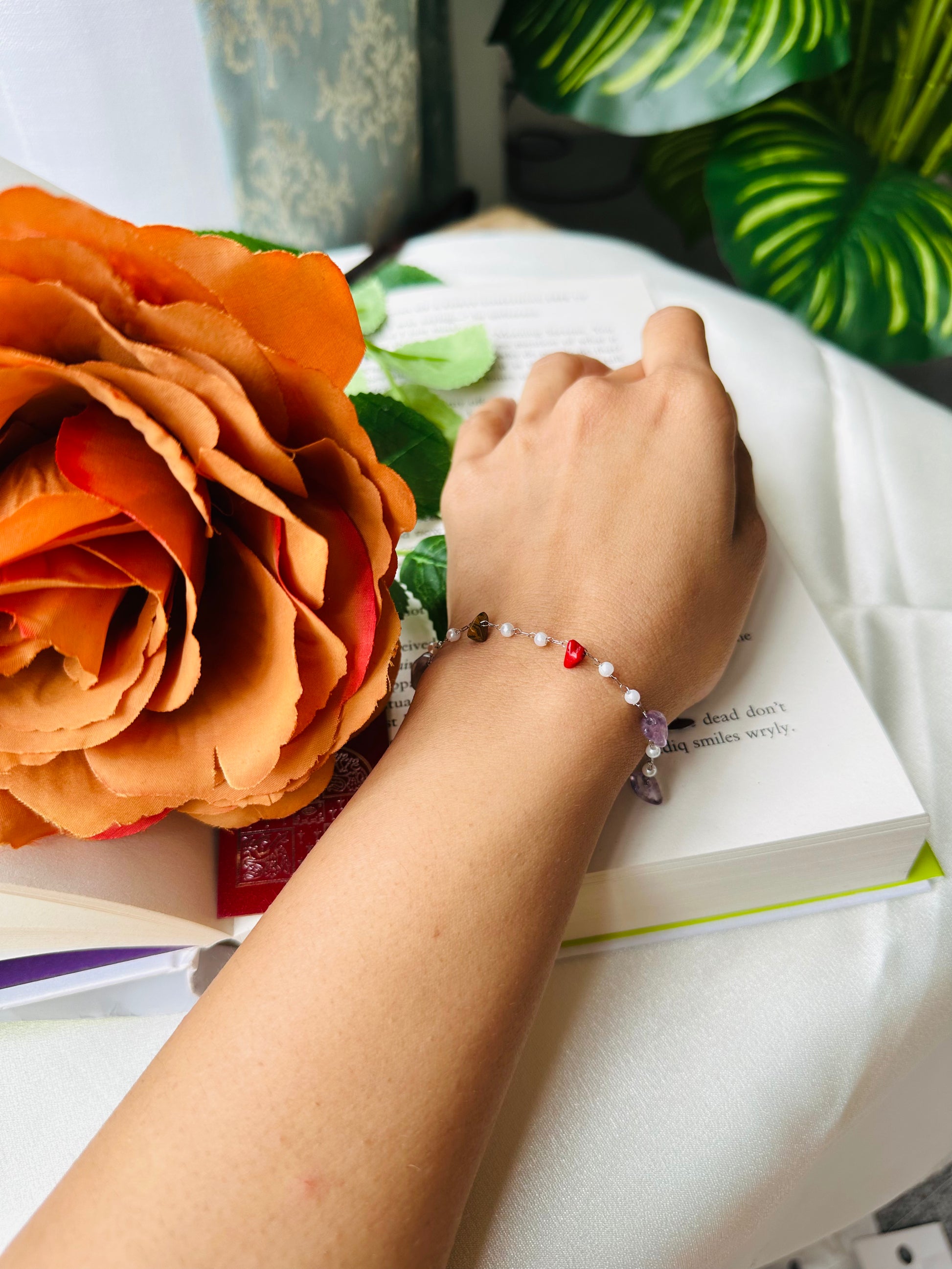 The centre of attention of this bracelet is a radiant red stone, symbolising the essence of love and passion. The bracelet features delicate white pearls (Faux), thoughtfully spaced between each colourful gem, adding a touch of sophistication and grace.
