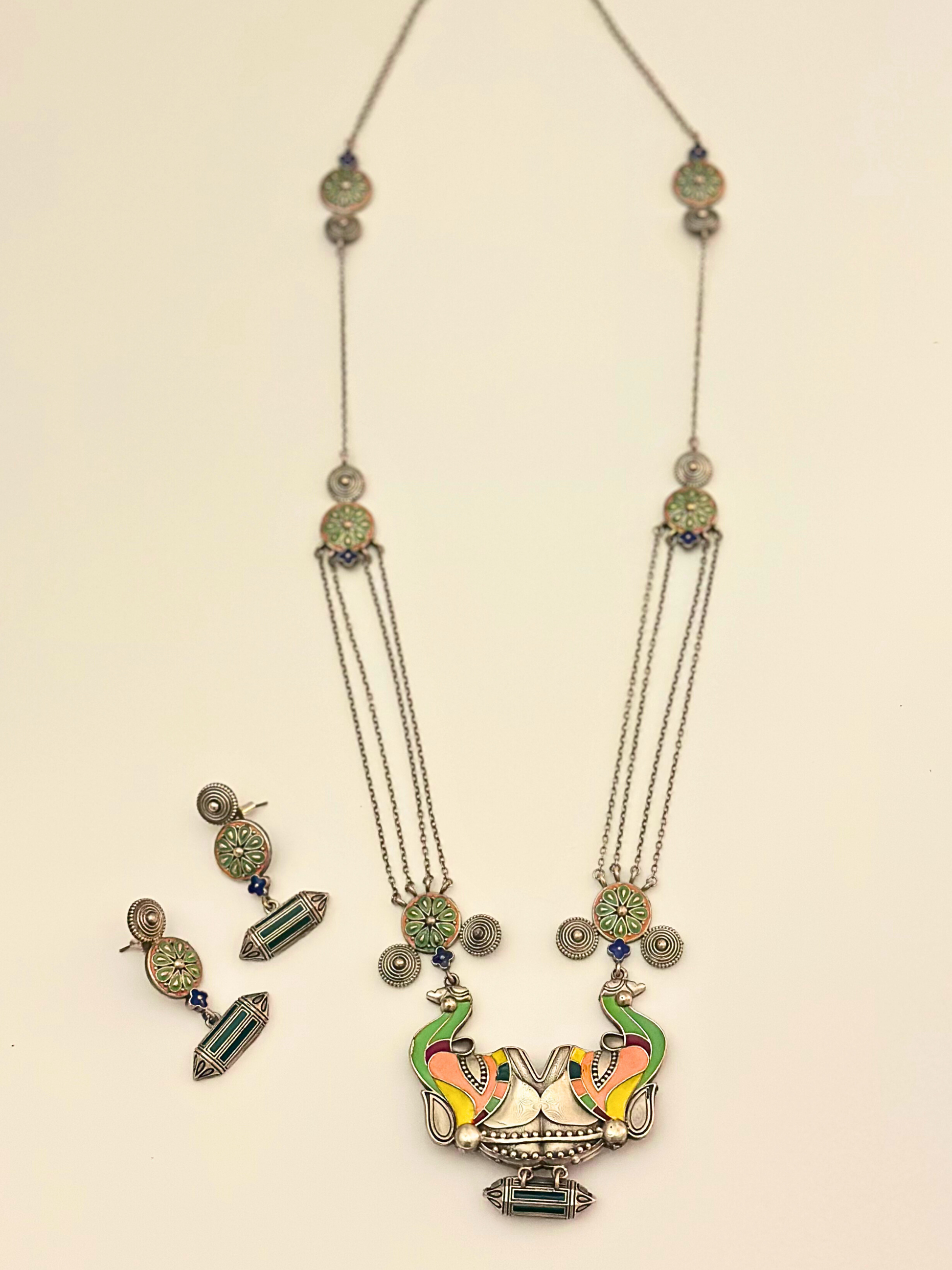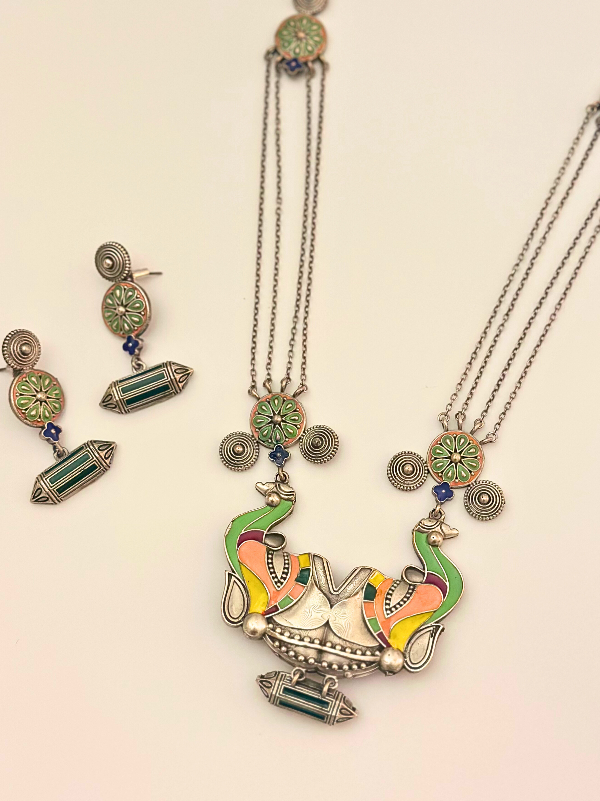 Celebrate the spirit of the wild with the Tribal Tusker Statement Necklace Set with Earrings, a tribal-inspired jewellery ensemble that combines intricate artistry with vibrant colours. The centrepiece features a geometric elephant pendant adorned with small circular structures along the chain, capturing a perfect balance of tradition and contemporary design. Accented in green, peach, and yellow hues, the pendant ends in a talisman-like charm, symbolising protection and good fortune. The matching hanging earrings echo the pendant’s unique motifs, making this set a bold and harmonious statement for any occasion.