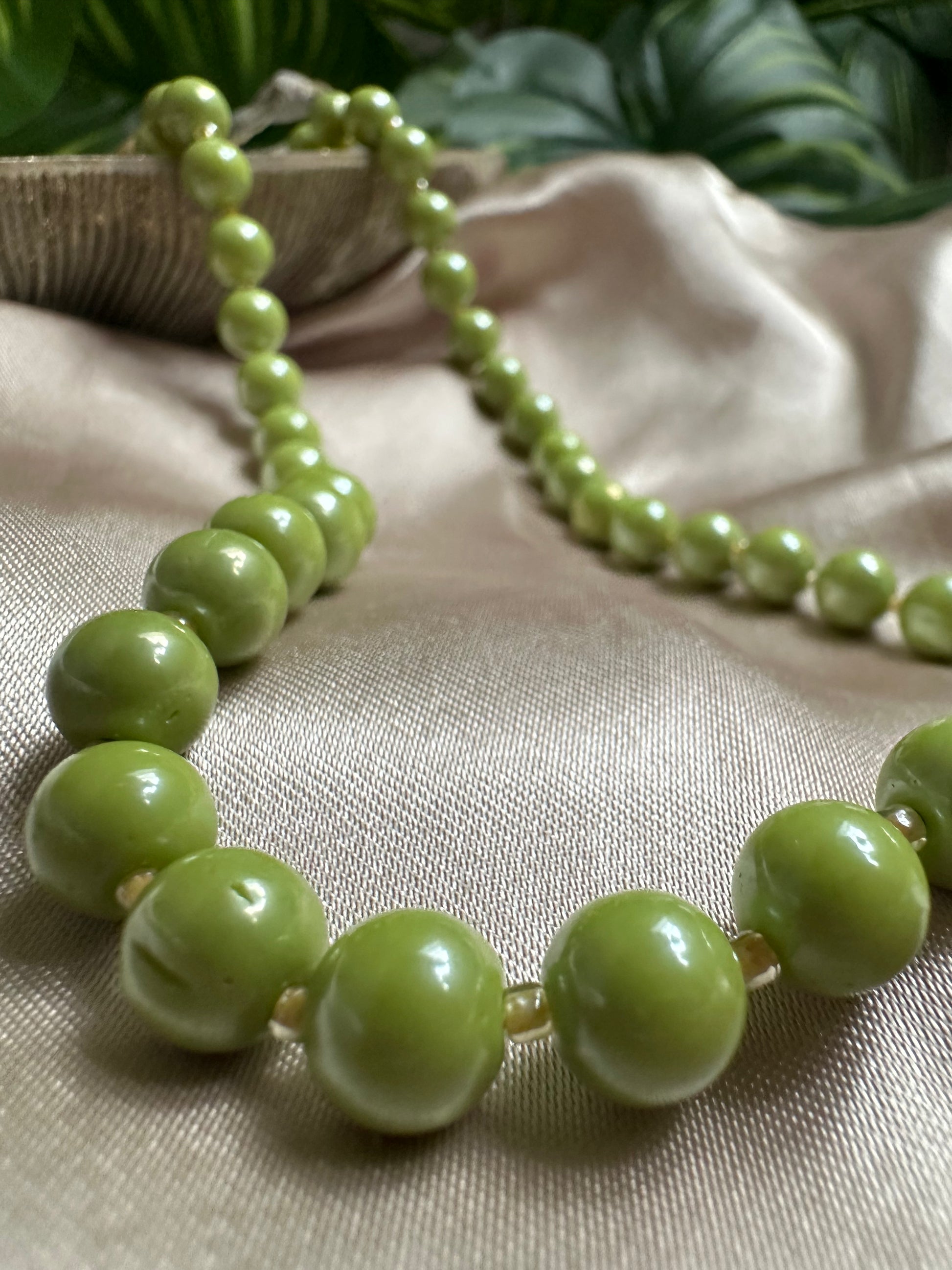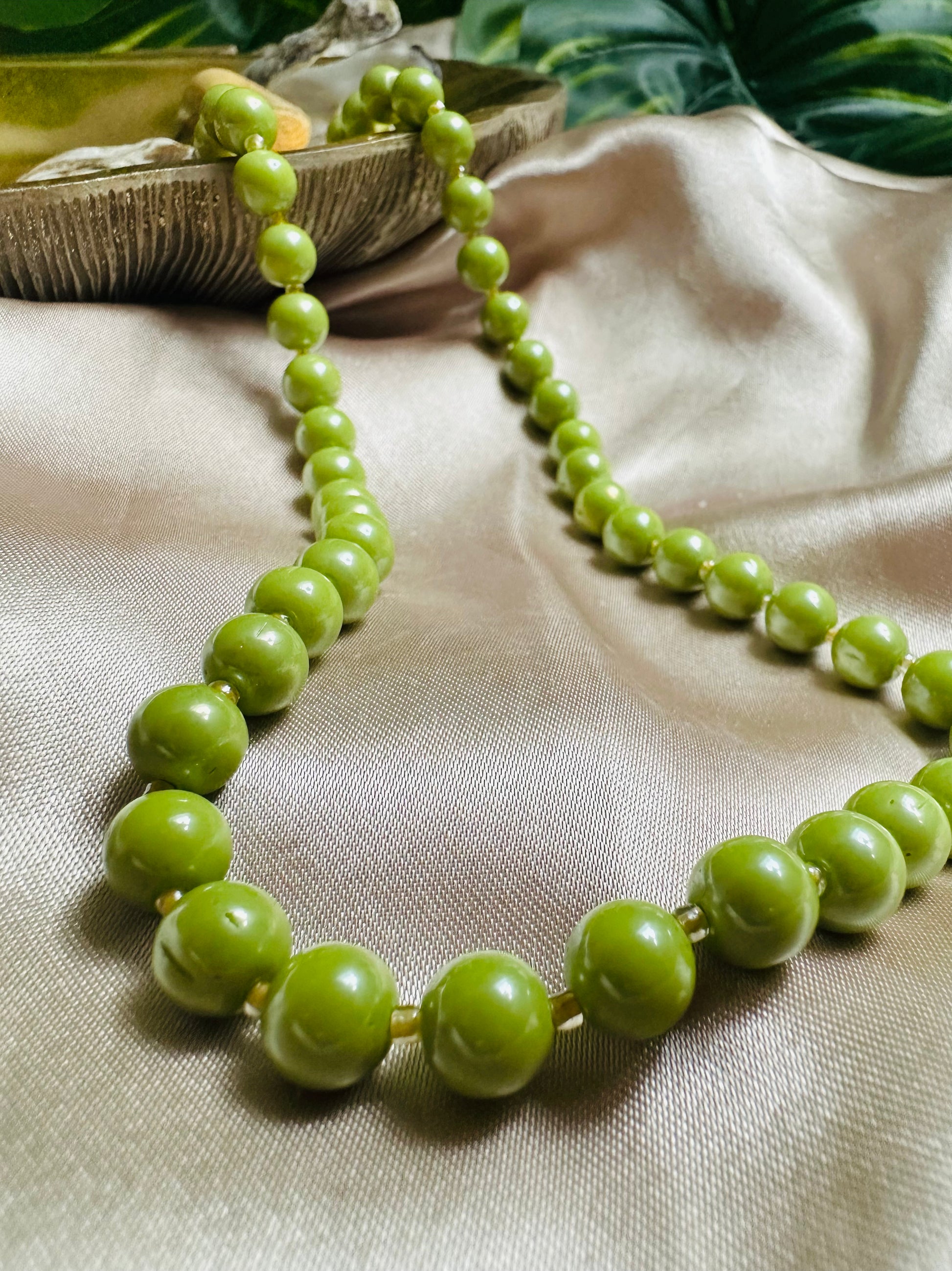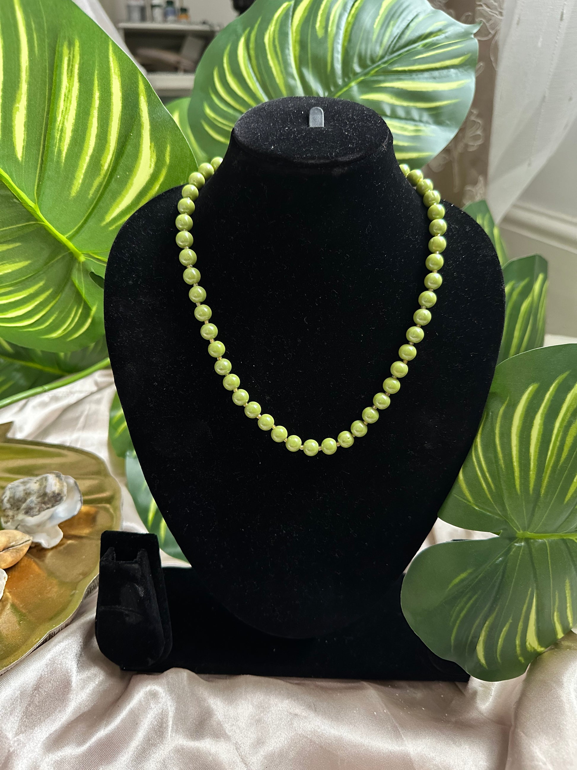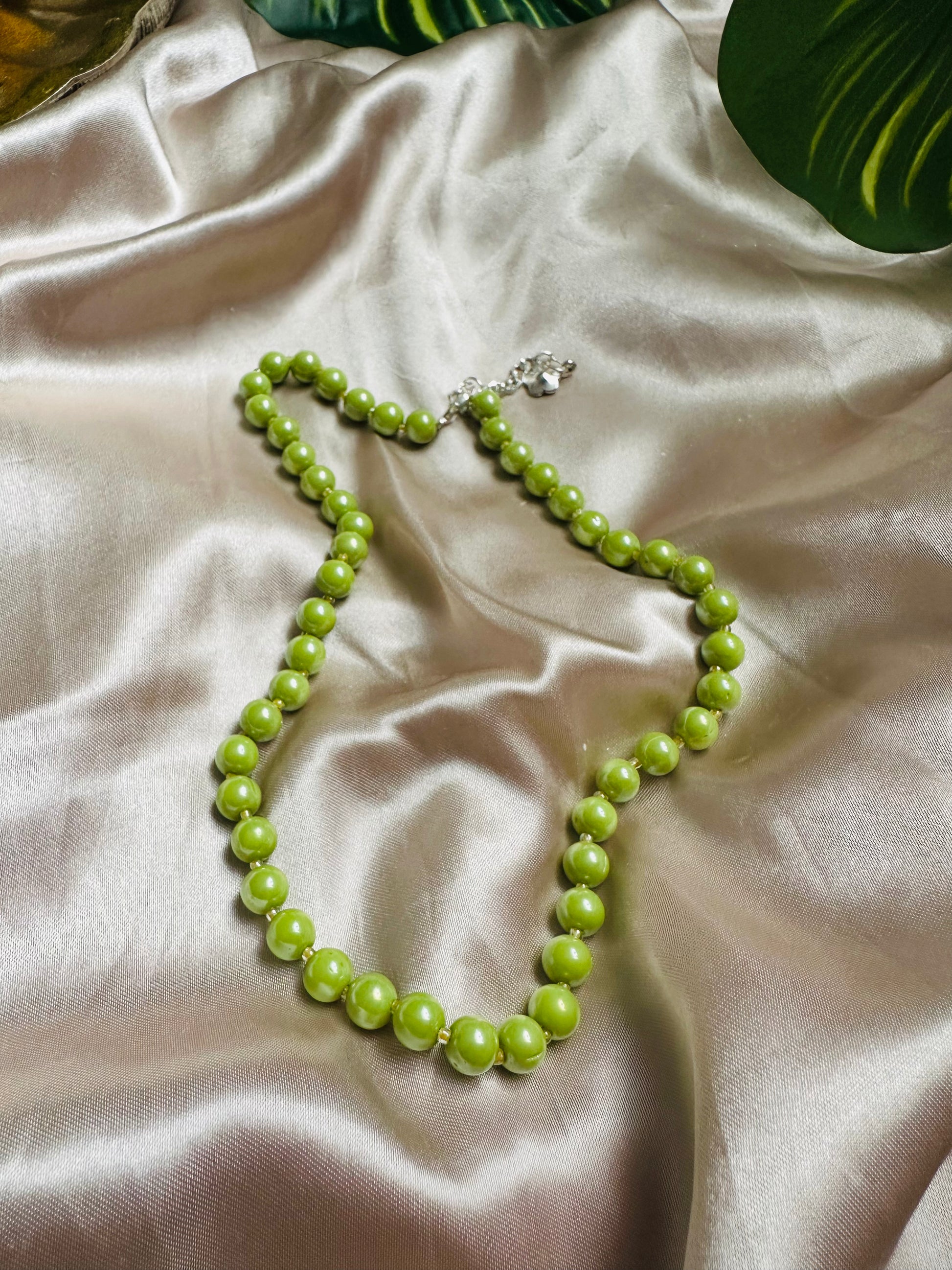 Crafted with elegance and sophistication, this necklace adds a refreshing burst of colour to any ensemble, making it perfect for both casual and formal occasions. The subtle green pearls (faux) are strung together with precision, creating a harmonious blend that embodies the spirit of tropical splendour.