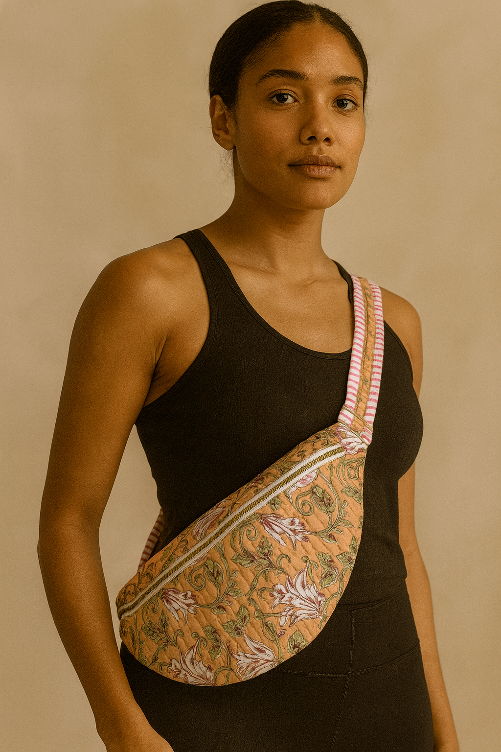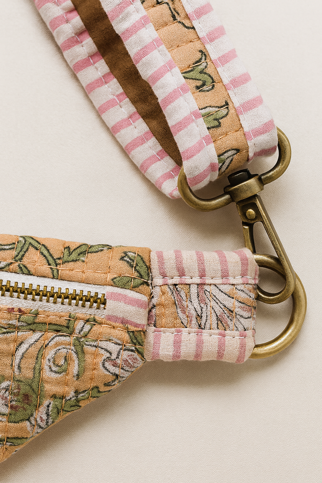 The floral design reflects the gentle rhythm of vines and blossoms—subtle, calming, and intricately hand-block printed using eco-friendly dyes. Each pattern is carefully placed on soft, breathable cotton fabric and quilted for texture, comfort, and durability. It’s not just a bum bag—it’s a celebration of traditional craftsmanship and thoughtful design.