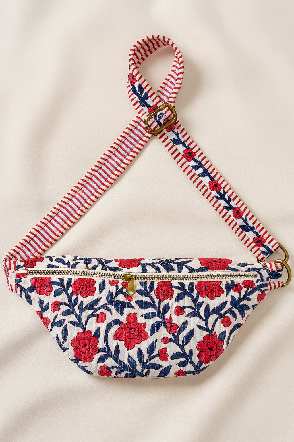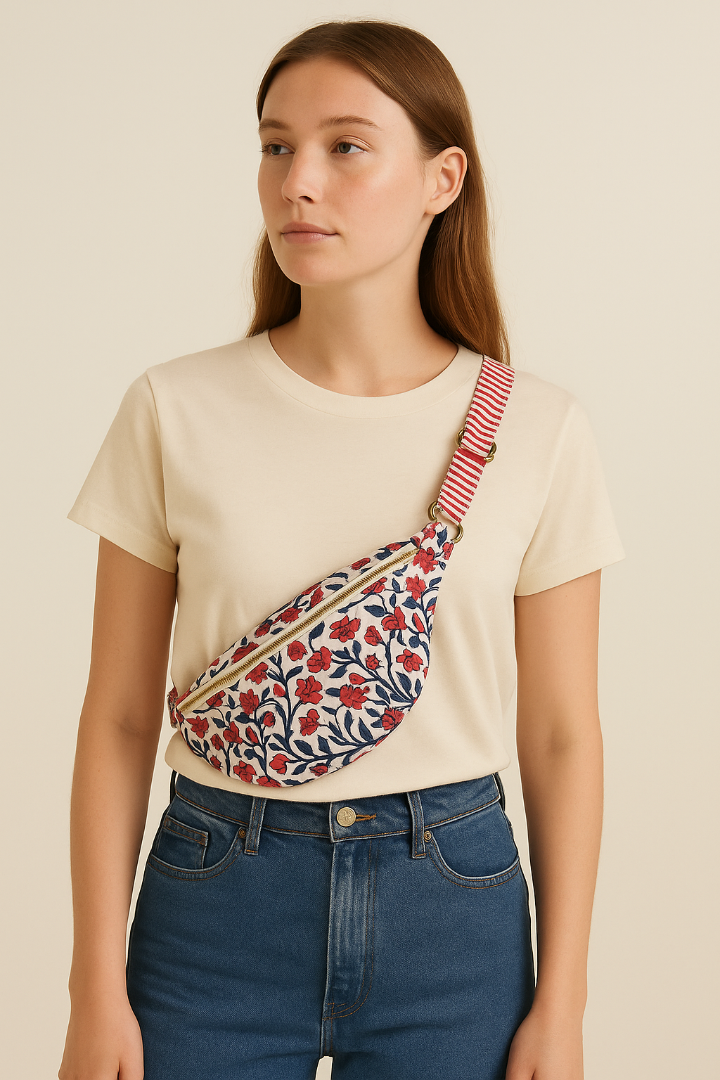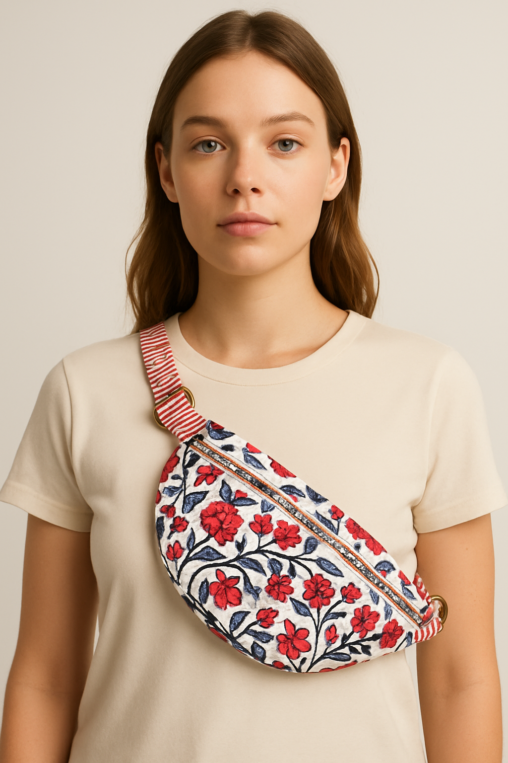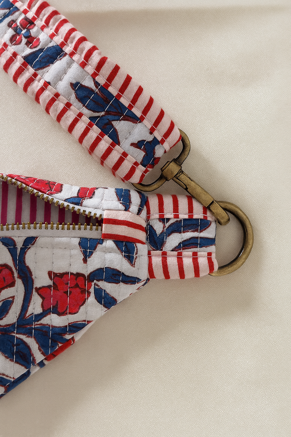Step into timeless elegance with Zeba, a beautifully crafted fanny bag inspired by the lush, ornamental charm of Mughal gardens. “Zeba”, meaning beauty and grace, perfectly captures the spirit of this accessory, where tradition meets modern style. Featuring a delicate hand-block floral print in vivid red and deep indigo on soft quilted cotton, Zeba is as eye-catching as it is functional. The striped adjustable strap adds a playful contrast, while the spacious zippered compartment, lined with coordinating stripes, keeps your essentials secure and organised.